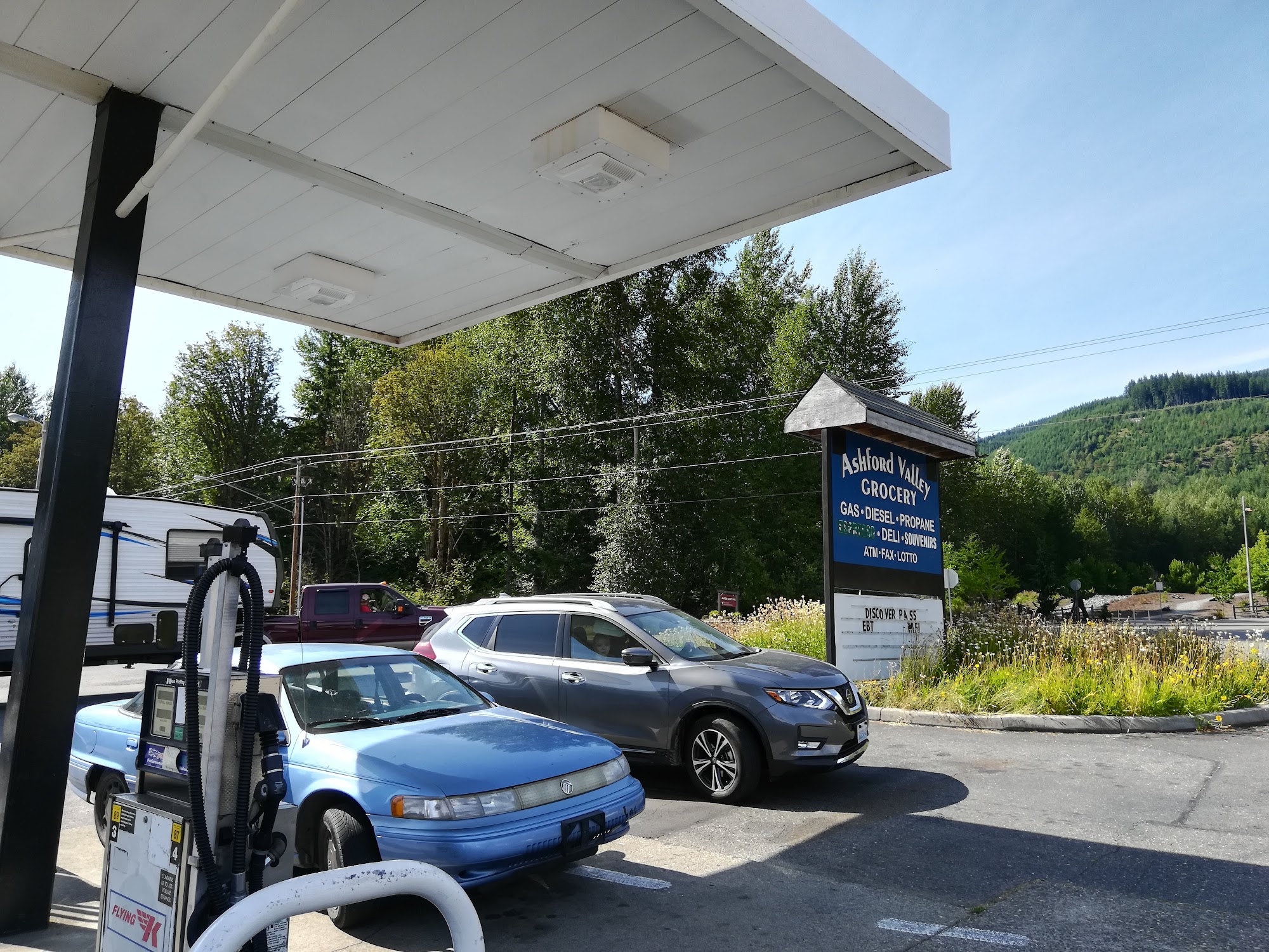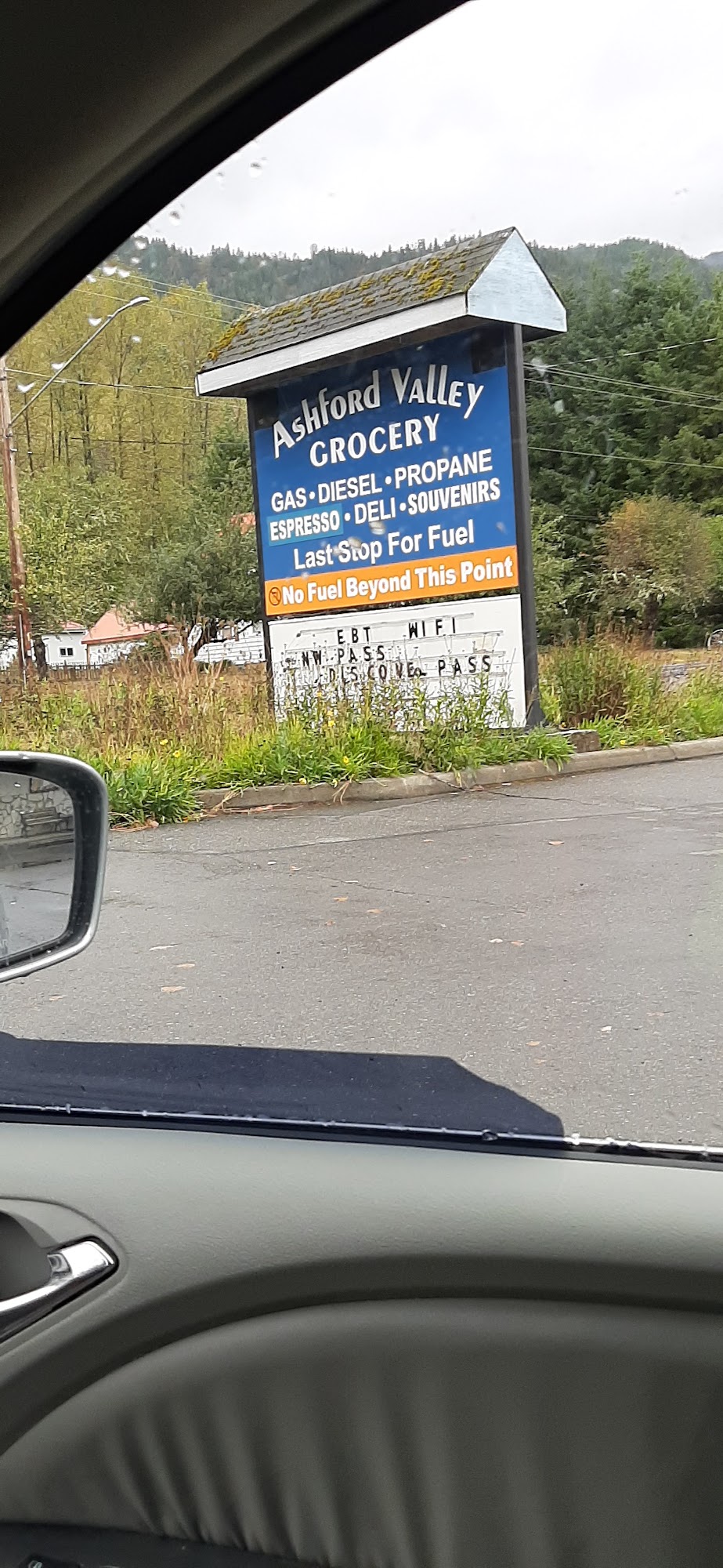 Ashford Valley Grocery is a small gas station and convenience store, the only grocery found in Ashford town. It has a traditional Taiwanese grocery store decoration. The store carries a good variety of products, snacks, drinks, and most things you might be looking for, similar to what a 7-Eleven might carry but without hot instant snacks or cooked food. There are very few fruits, vegetables, and fresh meats available. The store accepts credit cards and also sells souvenirs. The employees provide nice and warm hospitality and are friendly. The bathrooms, however, are not super clean. A notable point is that there are no prices displayed on items; you must ask for a scan to check. The prices are steep and high, often $3 to $5 more per item than normal, so it is best to stock up on fresh food and groceries at a bigger supermarket before arriving. The nearest full grocery store is at least a half hour away in Eatonville.