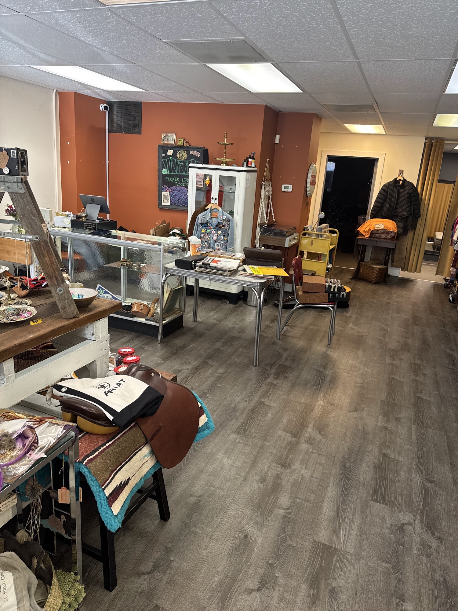 Pucker Huddle Goods is a sweet and fun vintage thrift shop in downtown Bingen, WA. It is a great addition to the Gorge, packed with a variety of things for a proper treasure hunt. The shop offers great vintage and unique clothes, jewelry, collectibles, accessories, designer bags, Turkish rugs, and more, all at prices that aren't insane. The friendly, knowledgeable, and welcoming owner has a kind energy, letting customers roam or assisting them. It is a beautiful and organized shop, not overwhelming, and a must-visit.