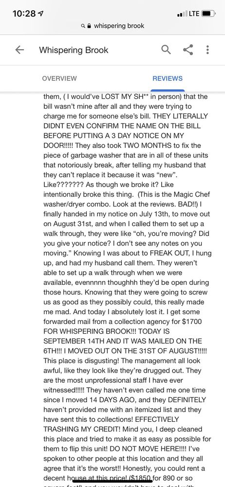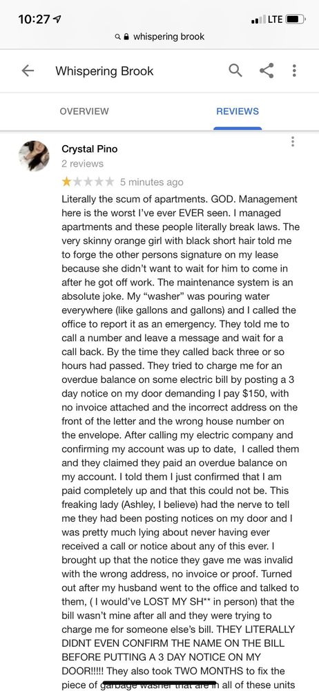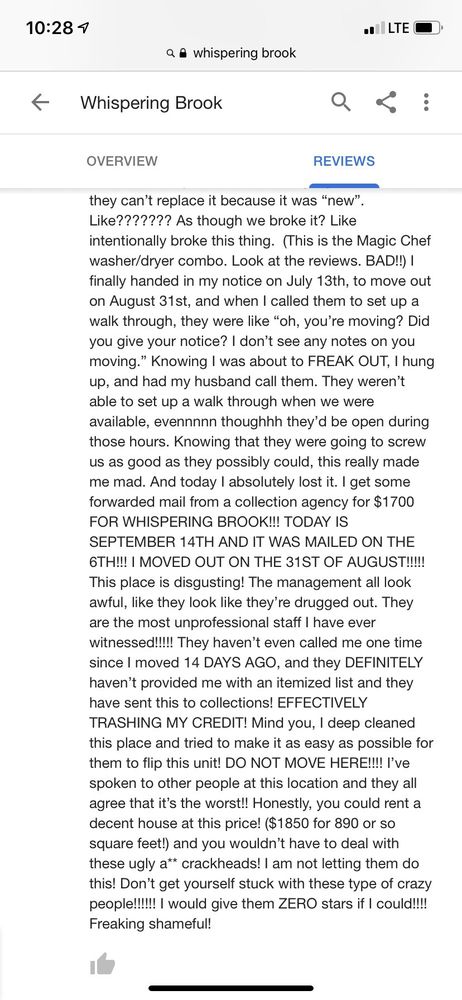 Whispering Brook Apartments offers quiet and peaceful living in a solid apartment complex. The units are gorgeous and include features like a fireplace and in-unit washer and dryer. The office staff is quick to respond. The maintenance team is outstanding, professional, friendly, and respectful, completing work orders quickly and skillfully, which provides residents with peace of mind. The area is generally very quiet, though occasional plane noise is noted.