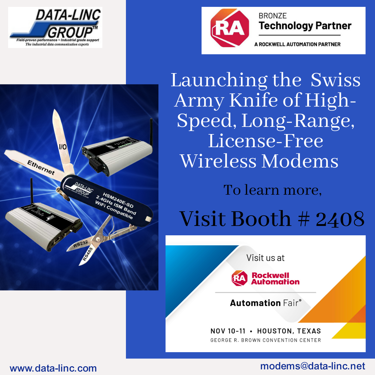 DATA-LINC GROUP is a leading provider of industrial data communication solutions -designing and manufacturing superior quality modems for a broad range of automation applications. Our complete line of industrial-grade modems provide reliable, robust data communications even in the most demanding environments. Range of wireless, license-free radio modems also include high-speed, long-range in the 900Mhz, 2.4Ghz and 5GHz bands.
