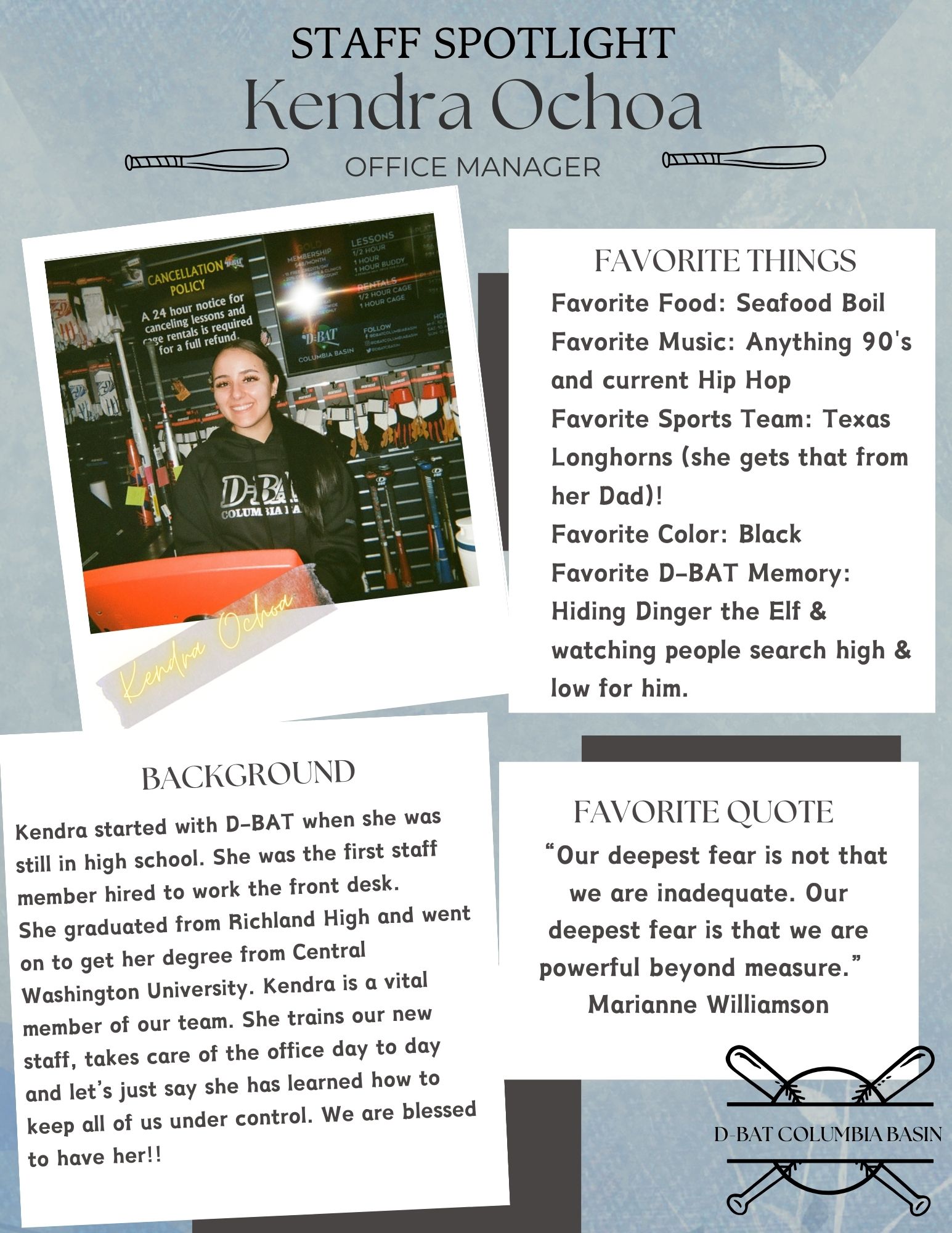 D-BAT Columbia Basin is a locally owned indoor baseball and softball training facility, part of a national franchise with over 150 locations. The facility offers automated batting cages, private instruction for baseball and fastpitch softball, camps, clinics, training cage rentals, Trackman indoor golf simulators, and a fully stocked pro shop. Reviews highlight the friendly and helpful staff, with special mentions of coaches like JJ, who provide excellent one-on-one coaching that helps young players improve while having fun. The facility is noted for being well-maintained, clean, and suitable for players of all skill levels. Customers appreciate the reasonable pricing and the enjoyable experiences for both practice and entertainment. D-BAT Columbia Basin also serves as a great venue for events, such as kids' birthday parties, where children of various ages can engage in activities like batting cages, t-ball, and kickball, all while enjoying a decorated party area. Overall, D-BAT Columbia Basin is highly recommended for anyone looking to enhance their baseball or softball skills or to host a fun and memorable event.