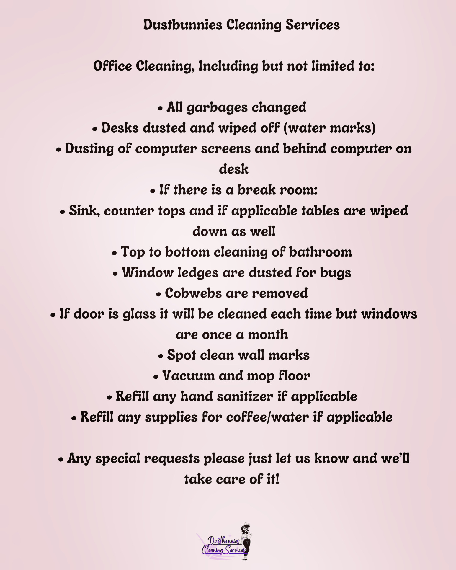 Dustbunnies cleaning service Is a high-quality service that is dependable, thorough and reasonably priced. I would recommend them for any cleaning job that you may have. Courtney Nelson, the owner is resourceful hard-working and easy to deal with. She will make sure that the job is done right.