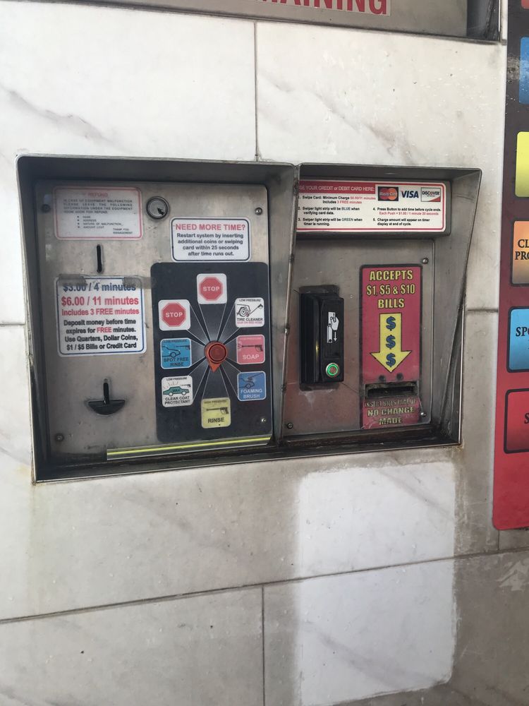 This place car wash worked as expected. I did not run into issues like what others faced in the review. The water pressure was great and the minimum price was $1.75 for 3 minutes. The machine had just the coin option. The best way to clean the car when you take the car off-road on a rainy day and mud struck to mud flaps.