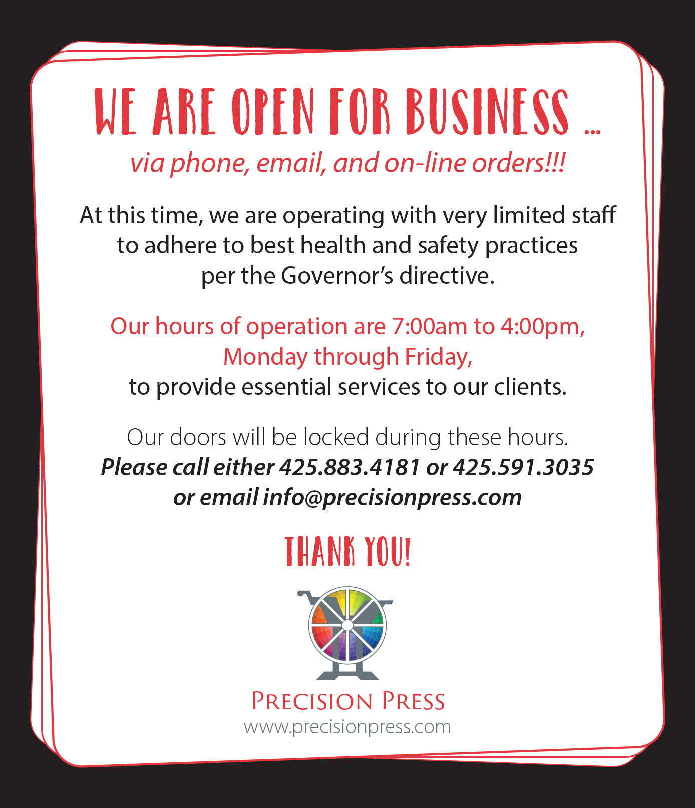 We've been using Precision Press for our Business cards for at least 7 years now. They're always responsive and do a good job. Extra thanks to Sherrie.