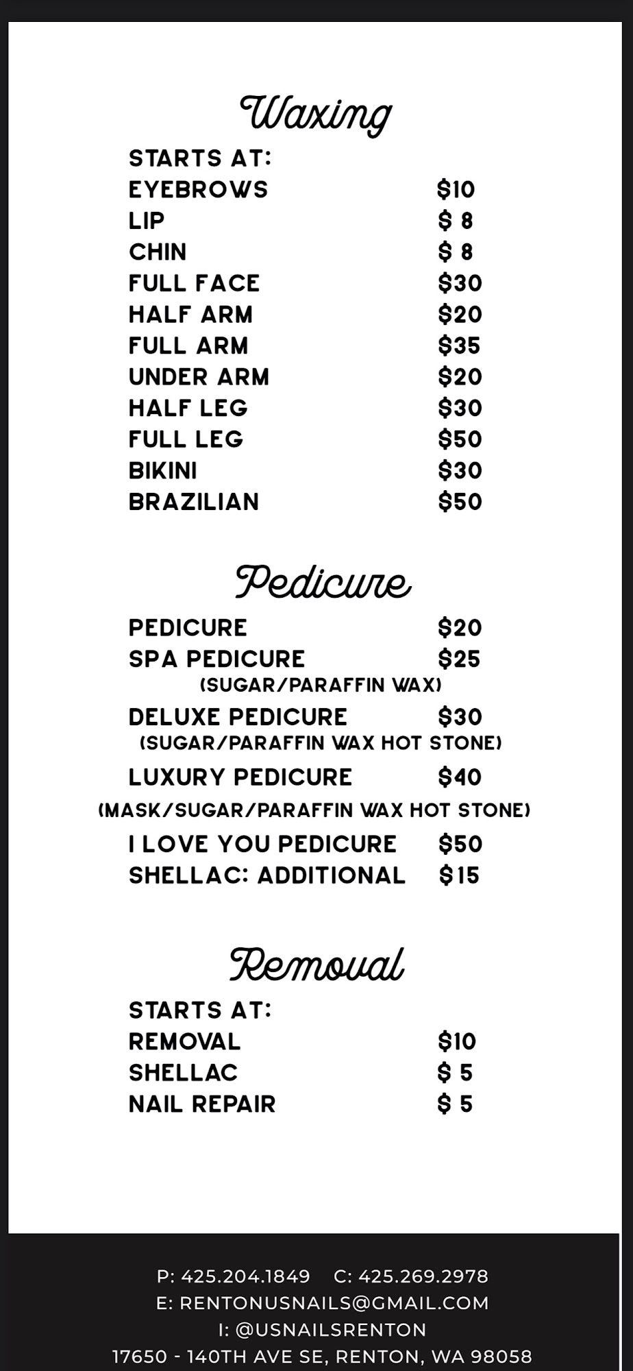 Us Nails Renton is a full-service nail salon that values customer service and a safe environment. The owners are kind and helpful, creating a welcoming atmosphere. Technicians like Houng, Joanne, and Hang have received high praise for their skill and attention to detail. The salon maintains a clean and professional setting, with staff eager to assist with color matching and design. Many customers have reported excellent experiences, highlighting the salon's cleanliness, quality of work, and reasonable prices. Reviews note that the pedicure services are particularly satisfying, and many appreciate that they do not need to fix anything at home, as everything is done correctly the first time. With the durability of services like acrylic nails being praised, Us Nails Renton is becoming a go-to spot for those looking for reliable and affordable nail care.
