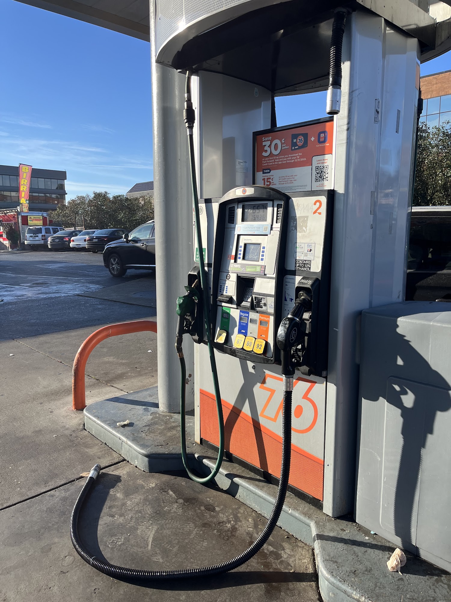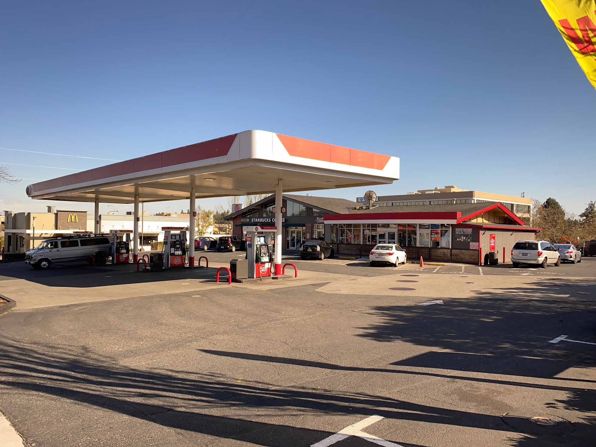 76 is a national gas station known for decent prices on gas. The location is right off I‑5, but on the opposite side of the road because there is a median you can't pass. It is often crowded with people hanging around looking for money and sometimes looking in cars, so it can be a hassle to avoid them. The setup of pumps is not great, making it tough to get out and back on the road. The station has a 24‑hr Starbucks in the same building, which many customers praise for great service, especially at 2 am. The Starbucks is the only 24‑hour location, but it often has a line for the drive‑through, even when the walk‑in lobby is open for take‑out. The gas station could use a little cleanup, and there is congestion from the Starbucks, the drive‑through, and leaving the station after filling up. It usually has reasonable prices for gas, well‑kept fuel pumps, and a good selection of snacks and items in the mini‑mart.