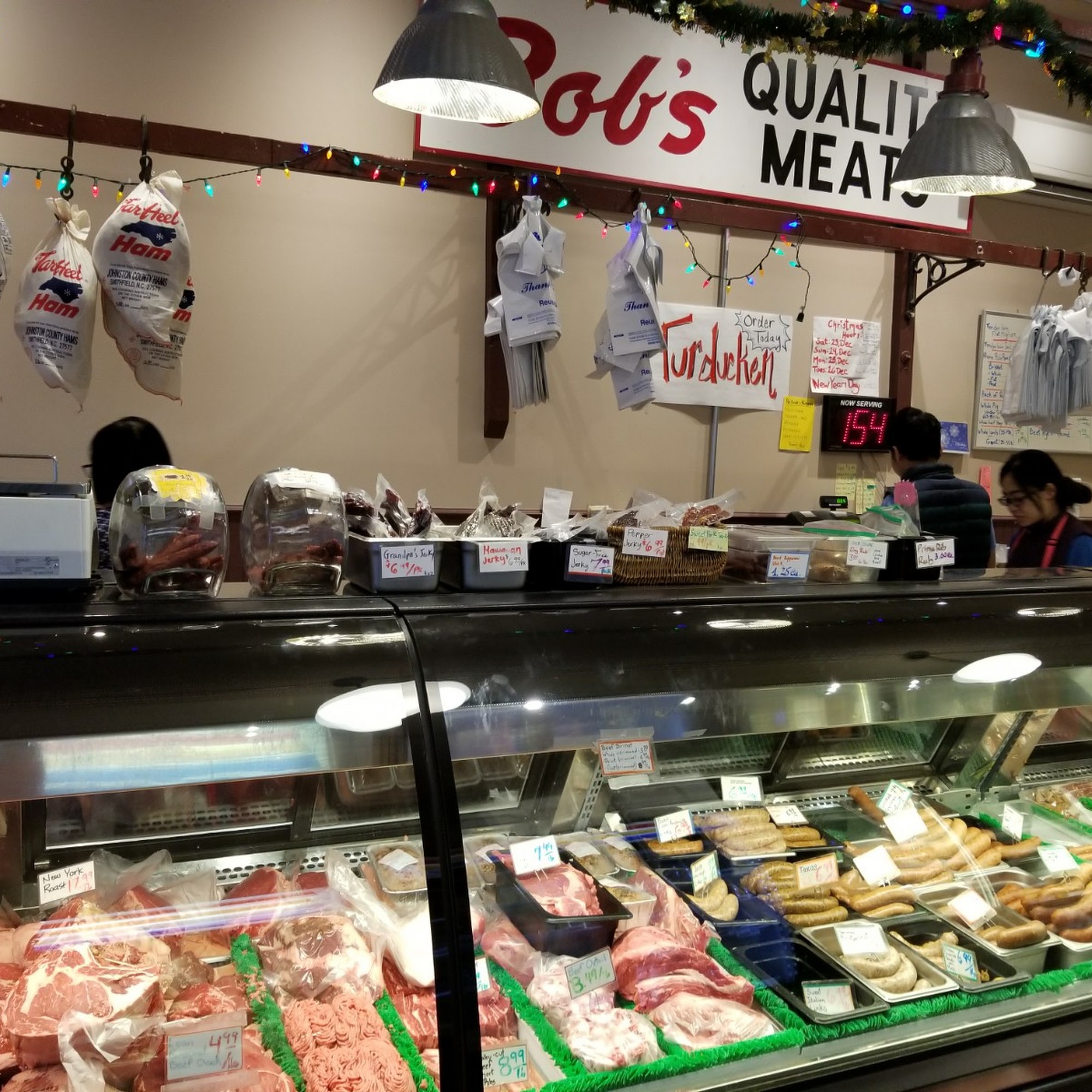 Bob's Quality Meats is a real local butcher shop with great meats and a nice selection. The food is absolutely amazing with fantastic meat and flavor. They have a lot more variety than a normal grocery store, including unusual meats that can be hard to find elsewhere. Their beef hot links are the best, and the Texas links are plenty spicy. It is a great place to feed a crowd, especially for a Thanksgiving turkey, and they are a convenient neighborhood shop with reasonable prices and good hours. The customer service is always good with amazing staff who are always willing to give advice. They provide great service, and the line moves reasonably fast even when busy. It is a highly recommended small shop and a go-to for many.
