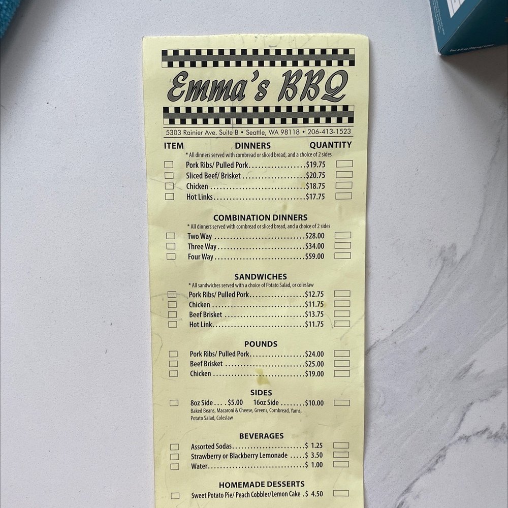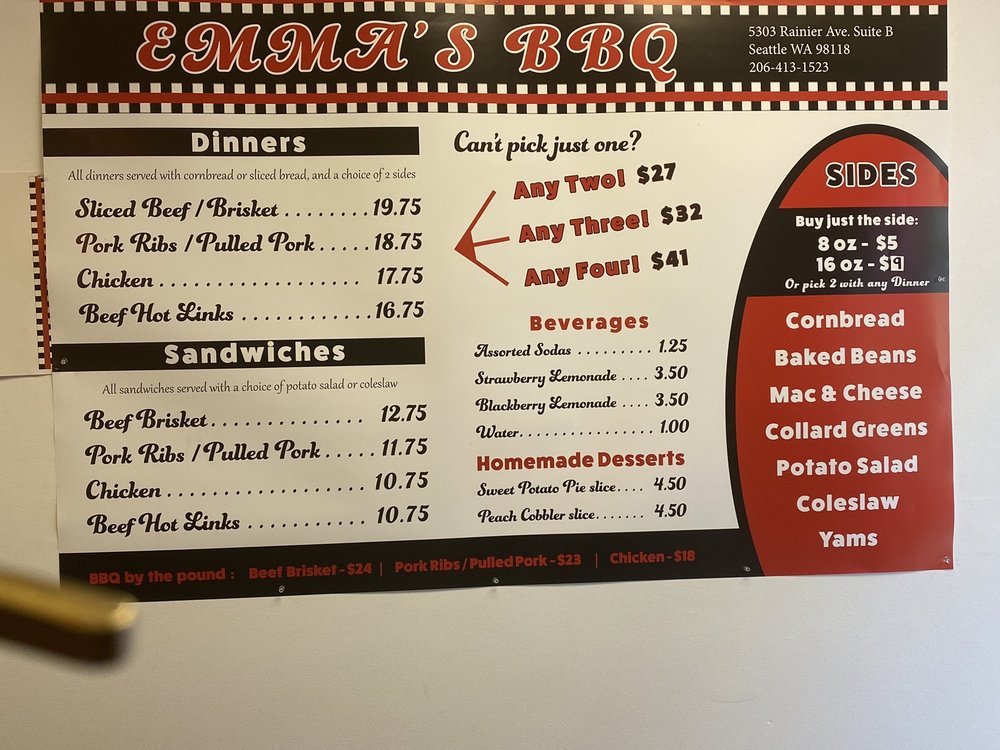 Emma's BBQ serves outstanding food with great flavors, including their flavorful pulled pork and delicious baked beans. This family-owned restaurant is known for its friendly and genuine service, with super sweet owners. It is a take-out only place, but the generous portions and excellent food make it worth a visit. Customers have raved about the 4 play, which includes ribs, chicken, pulled pork, brisket, beans, potato salad, and cornbread. The brisket is well flavored and easy to enjoy, while the ribs have a nice bark and are good sized. The chicken is well seasoned, and the pulled pork is great with or without sauce. Emma’s BBQ has a unique flavor profile that sets it apart from other BBQ places in the PNW. Be sure to try the spicy BBQ sauce on the side, and don't forget to wear stretchy pants! The blackberry lemonade is also a must-try. With a very pleasant staff and a welcoming atmosphere, Emma's BBQ offers an experience that feels like home.