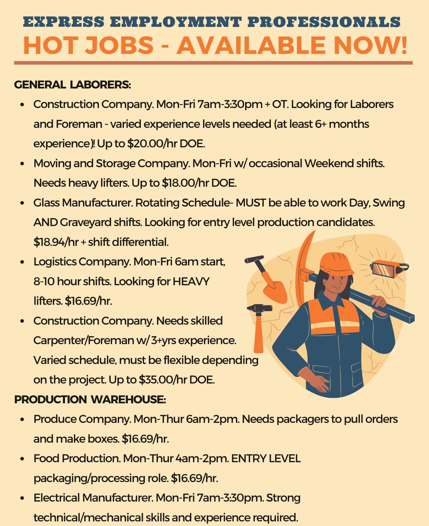 Express Employment Professionals is a helpful and friendly staffing agency. The staff is supportive, cool, down-to-earth, and professional. They provide a positive and productive experience with a deep understanding of the job market. The process is an easy flow, often connecting people with jobs instantly or the same day they walk in. They are great at finding work, even in difficult circumstances, and offer great starting pay. They assist with anything needed about the job for primary or secondary work. Many recommend them as a very helpful temp service.