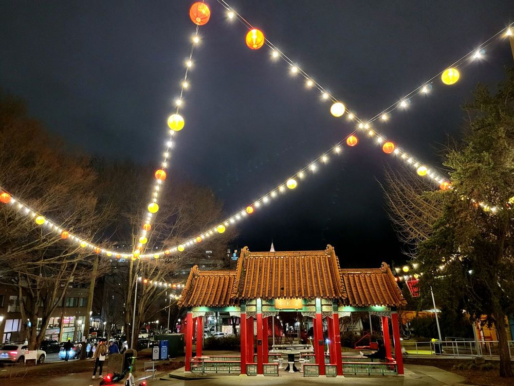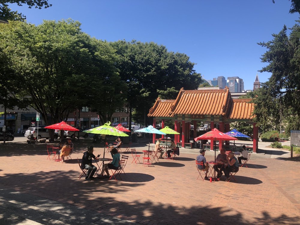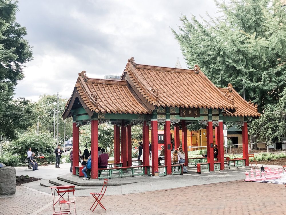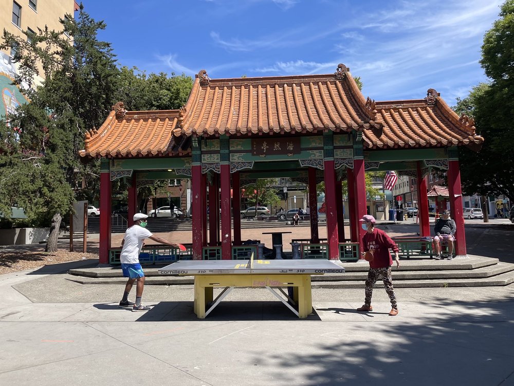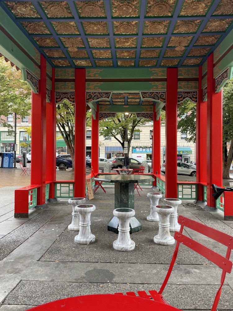 Hing Hay Park is a beautiful, Asian-themed park that is free to visit and offers a friendly, lively atmosphere. It is popular with many elderly Chinese people who gather to play ping pong, chess, or chat. The park is lively with buskers and Chinese songs played in the background. It features picnic tables, some covered, and benches for relaxing. The park is dog-friendly with several dogs seen around. The pavilion is a favorite spot, and nearby places like Yi Fang and Fuji Bakery serve great snacks and baked goods. Visitors can enjoy the vibrant community, watch sports, and take photos, making it a safe and clean space for relaxation and socializing.