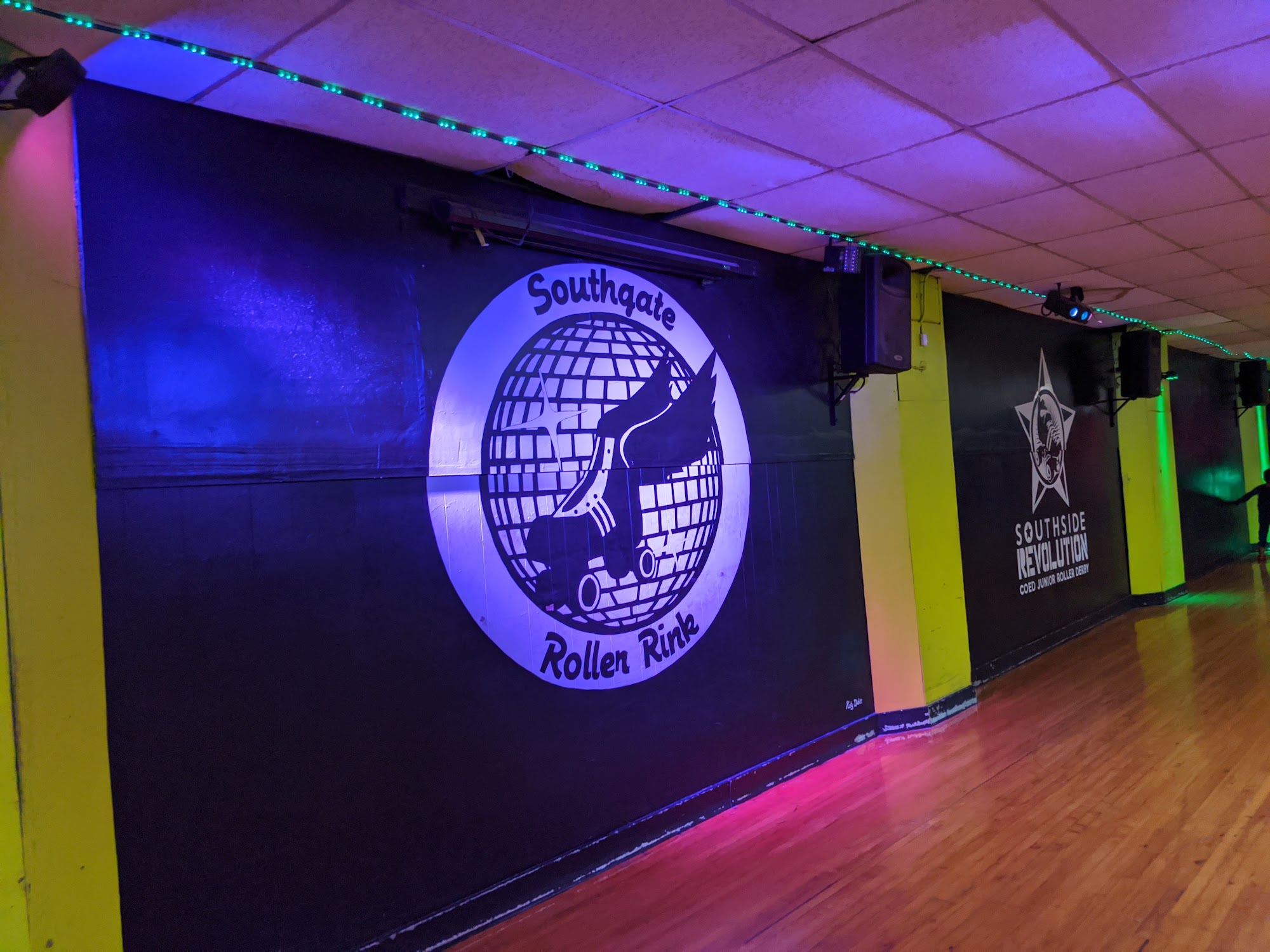 Southgate Roller Rink is a special place with a fun, nostalgic, and cool atmosphere. It is a great skating rink and an excellent place to experience youth, offering a very nostalgic experience. The venue features a really cool bar downstairs, which is cute and comfortable, with the bonus of being able to watch people skate. The atmosphere is enhanced by bands playing in the middle of the rink while you skate. The staff is super nice, helpful, and seem genuinely happy to be at work. The regulars are intimidatingly good but also very nice and helpful if asked for tips. The rink is never too crowded, making it a great place for kids' birthdays and date nights. There are plenty of old-school video games to play, along with soft pretzels with cheese and a great selection of non-alcoholic beverages. However, the floor is uneven, has dips, and is small, meaning skilled skaters will zig-zag around others. This can make it challenging for new or hesitant skaters to build confidence. It is recommended that less experienced skaters consider going with an equally skilled friend or avoid Monday nights when the best skaters are present. Despite the floor, it remains a fun roller rink and a good time.