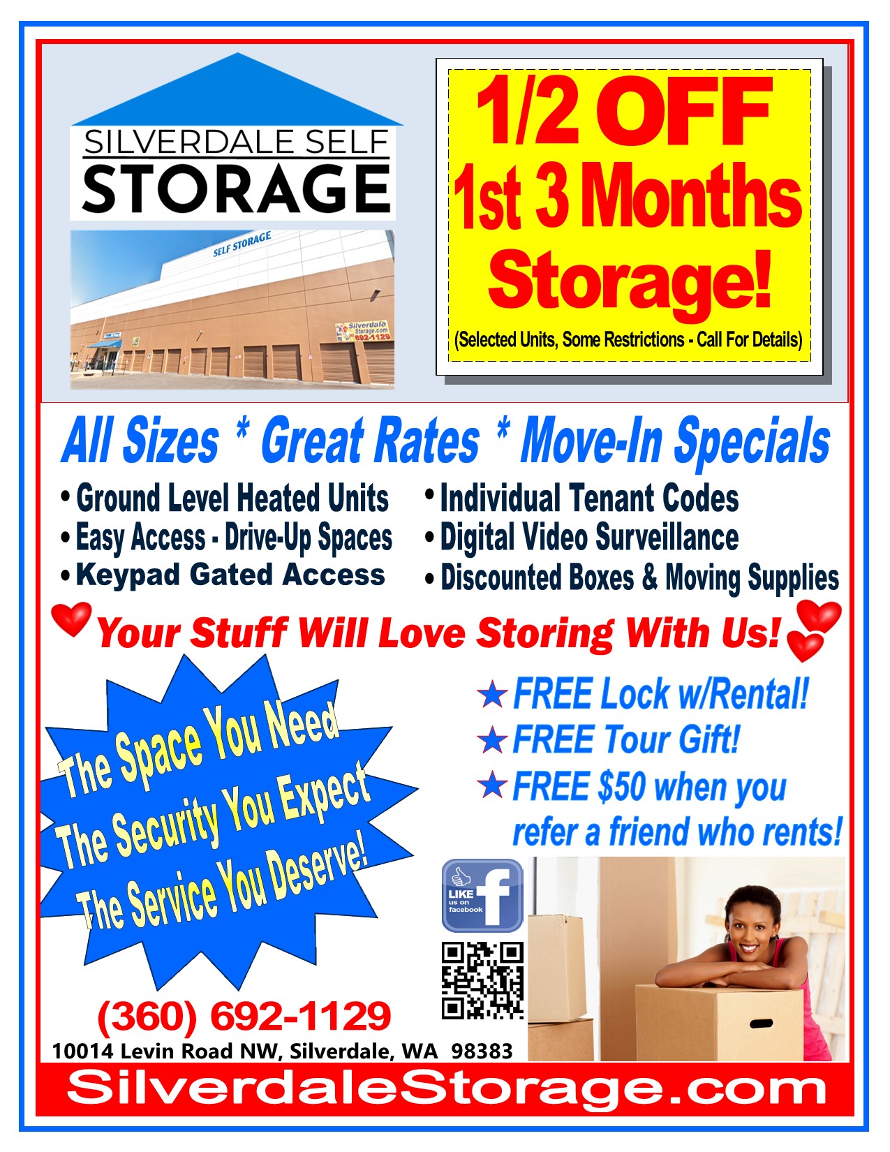 Silverdale Self Storage is a trusted and well-maintained facility offering a variety of storage options, including heated and unheated units, both drive-up and inside. Customers appreciate the clean, bright, and secure environment, with many noting that their belongings stay in excellent condition, thanks to features like climate control and 24/7 video surveillance. The staff is friendly, knowledgeable, and welcoming, providing great customer service without pressure or gimmicks. Convenient amenities include long access hours, unique entry codes for security, and the ability to rent and pay online, with rewards such as a free high-security lock and a gift for touring. The storage units are spacious and suitable for household items and antiques, maintaining a high level of cleanliness and ventilation. Customers also value the reasonable prices, flexible access, and helpful support from staff members. Overall, Silverdale Self Storage offers a secure, easy, and friendly experience, making it a reliable choice for storage needs in Silverdale.