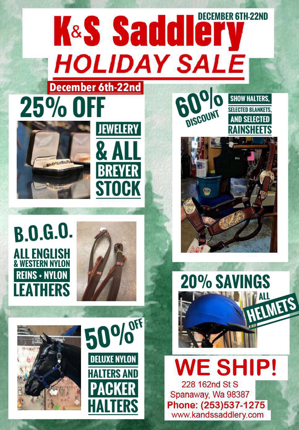 K & S Saddlery has been serving the needs of equestrians of all ages and disciplines throughout the United States for over 50 years! Conveniently located just off Pacific Avenue in Spanaway, Washington, we offer a full range of Western and English products, for the horse, rider, and barn. We also offer saddle cleaning, custom and leather repair work, blanket repair and saddle fittings by appointment. The K&S Saddlery ownership, management and staff are all veteran equine enthusiasts with more than 100 years of accumulated knowledge and expertise!