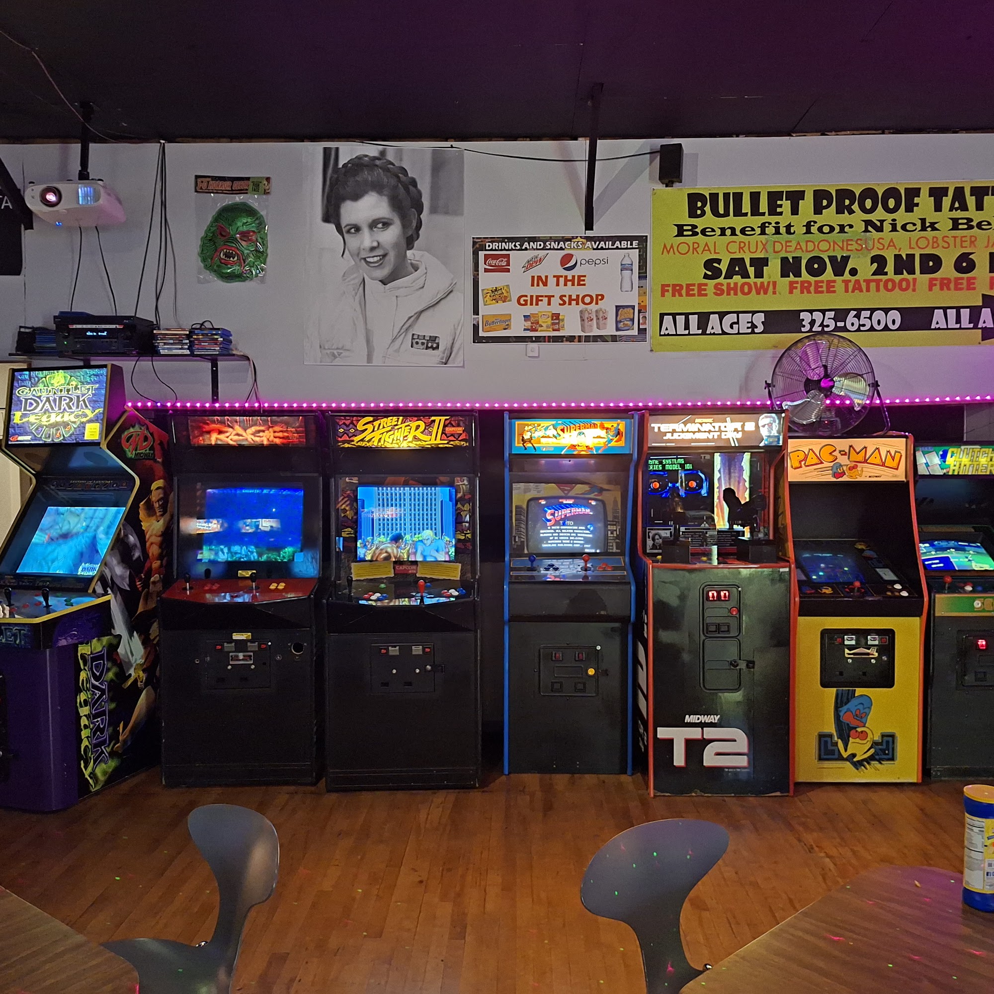 Pop culture museum, featuring 1 of a kind movie props, vintage toy display, movie posters and 155+arcade and pinball machines. registered Star Wars church. All ages $16.50 contribution all Machine set to Free play. also featuring low cost VR "Be Excellent"