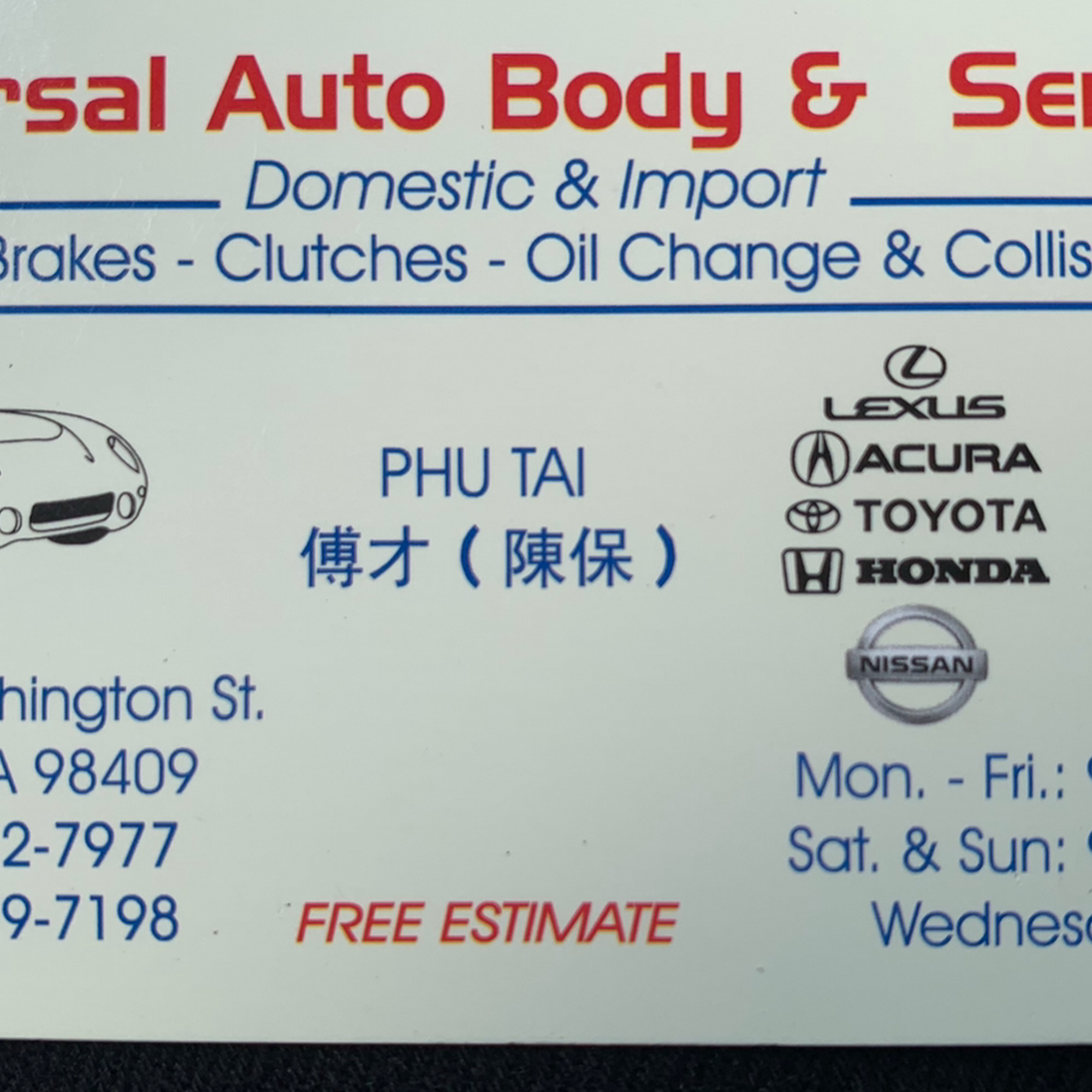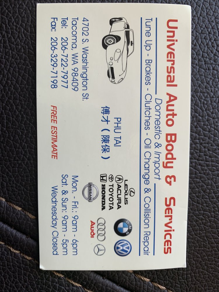 Universal Auto Body And Services is a highly recommended, honest, and reliable car shop. The owner and everyone there are super nice, providing incredible service and keeping things straightforward with no games or shortcuts. They diagnose the exact issue, explain everything wrong with the car, and perform the best work possible, from electrical repair to body work like reattaching bumpers. Repairs are completed efficiently, often within a few hours, at very reasonable prices that won't break the wallet. The shop is not fancy, but customers praise it as their number one mechanic for fixing issues correctly and ensuring they don't recur, with exceptional customer care like offering rides home.