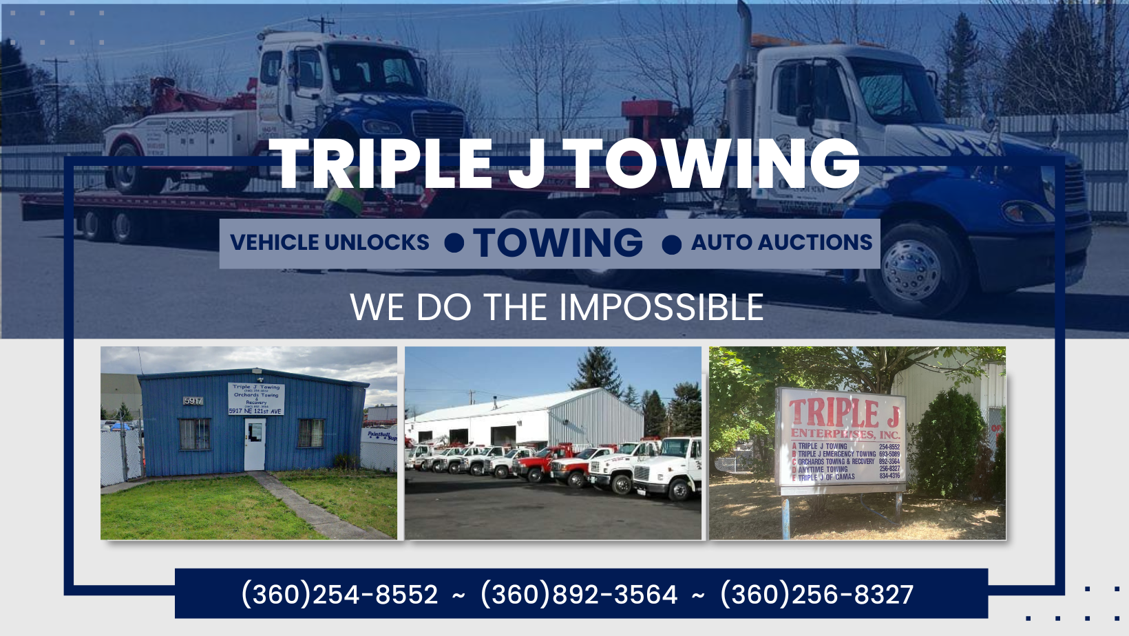 We here at Triple J Towing understand the frustrations of having your automobile break down. That’s why we offer up the most comprehensive towing Vancouver WA has to offer. We are a full service equipment moving and towing company here to serve you and your towing needs 24 hours a day, 7 days a week, 365 days of the year.