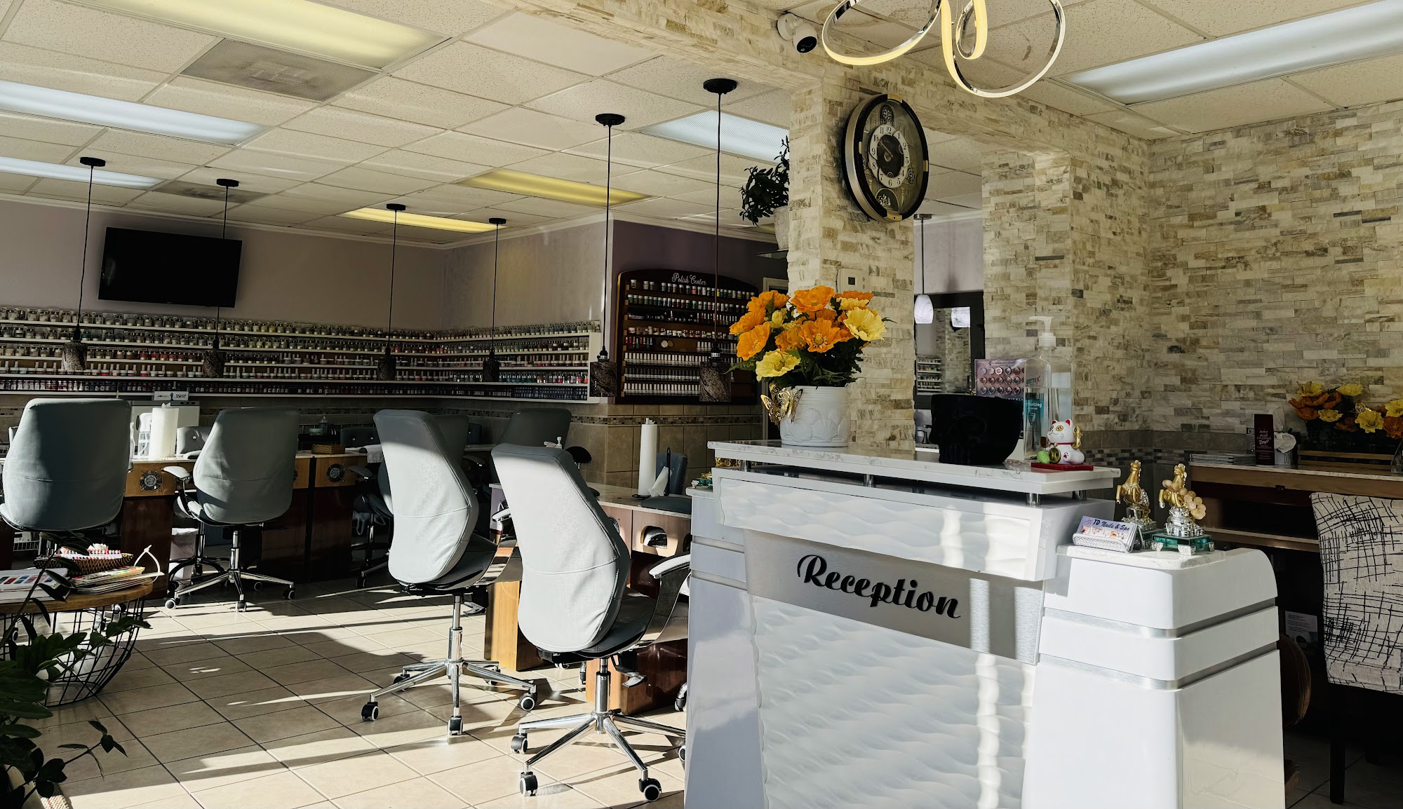 TD Nails & Spa is recognized for its clean, professional, and high-quality services. The staff is highly trained and qualified, ensuring trustworthy services. For the best results and client safety, only branded and high-grade products are used. Disposable pedicure liners are utilized, eliminating any risk of infections, as hygiene and sanitation standards are taken seriously with all precautions guaranteed. Clients consistently praise the salon for its quality and affordability, noting the friendly atmosphere and numerous color options. The nail technicians are described as the best, friendly, nice, listening to client requests, and executing them to perfection. They are articulate, and their work speaks for itself, accurately replicating desired looks from pictures. Manicures are thorough, with cuticles done perfectly, and pedicures are amazing. Employees are friendly and helpful, and the salon is accommodating, even for first-time pedicure clients. The business offers a relaxing atmosphere and a wide range of quality services, ensuring an amazing experience. Clients also appreciate the reality TV playing on multiple screens and the surprisingly good green tea.