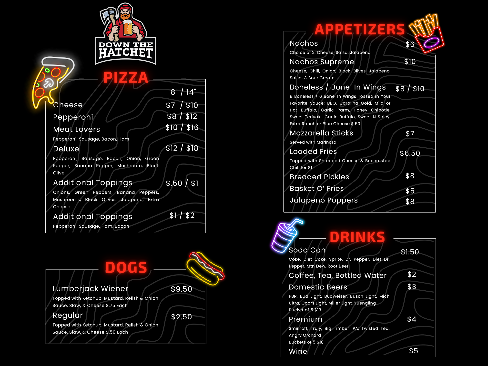 Down The Hatchet is a lively establishment that offers a unique and entertaining experience for visitors. According to the reviews, the business provides a range of activities, including pizza-making, axe/hatchet throwing, pool, darts, cornhole, and even inflatables for children on Sundays. The owners are described as "awesome," and the staff, such as Skyler and Sarah, are praised for their excellent service and assistance in helping customers improve their skills. The menu at Down The Hatchet features a standout item, the "Lumberjack" sausage dog, which is described as having a flavorful and smoky sausage with crispy skin, a soft and full-flavored bun, and fresh toppings. Customers have raved about the quality and size of this dish, with one reviewer stating it is "satisfying to the very last bite." Overall, Down The Hatchet is portrayed as a fun and engaging destination, suitable for parties, families, and friends looking for a unique and enjoyable experience. The positive reviews suggest that this establishment is a popular choice for those seeking a lively and entertaining atmosphere.