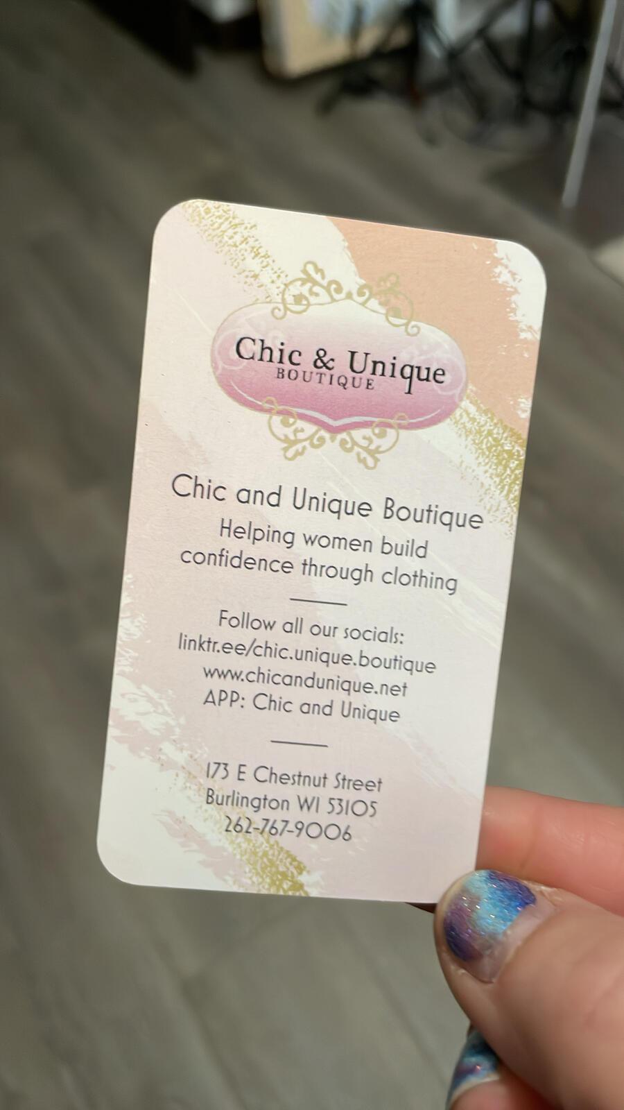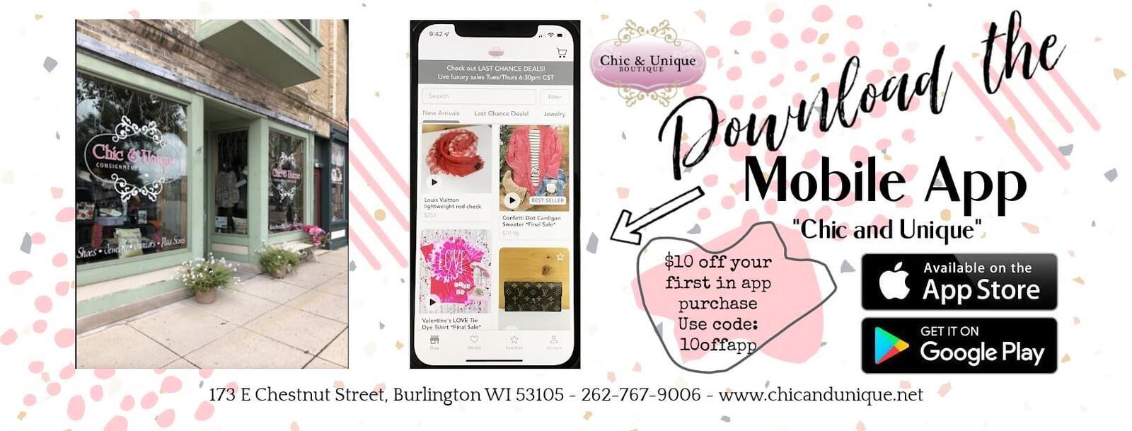 We are a women's new clothing boutique and consignment clothing shop carrying sizes XS-Plus. We offer brand new jewelry, accessories, handbags, candles and gifts, and authentic luxury brand goods. Shop in store or online our website or free app: "Chic and Unique" for fun, live shopping experience! We ship out of the USA to everywhere worldwide.