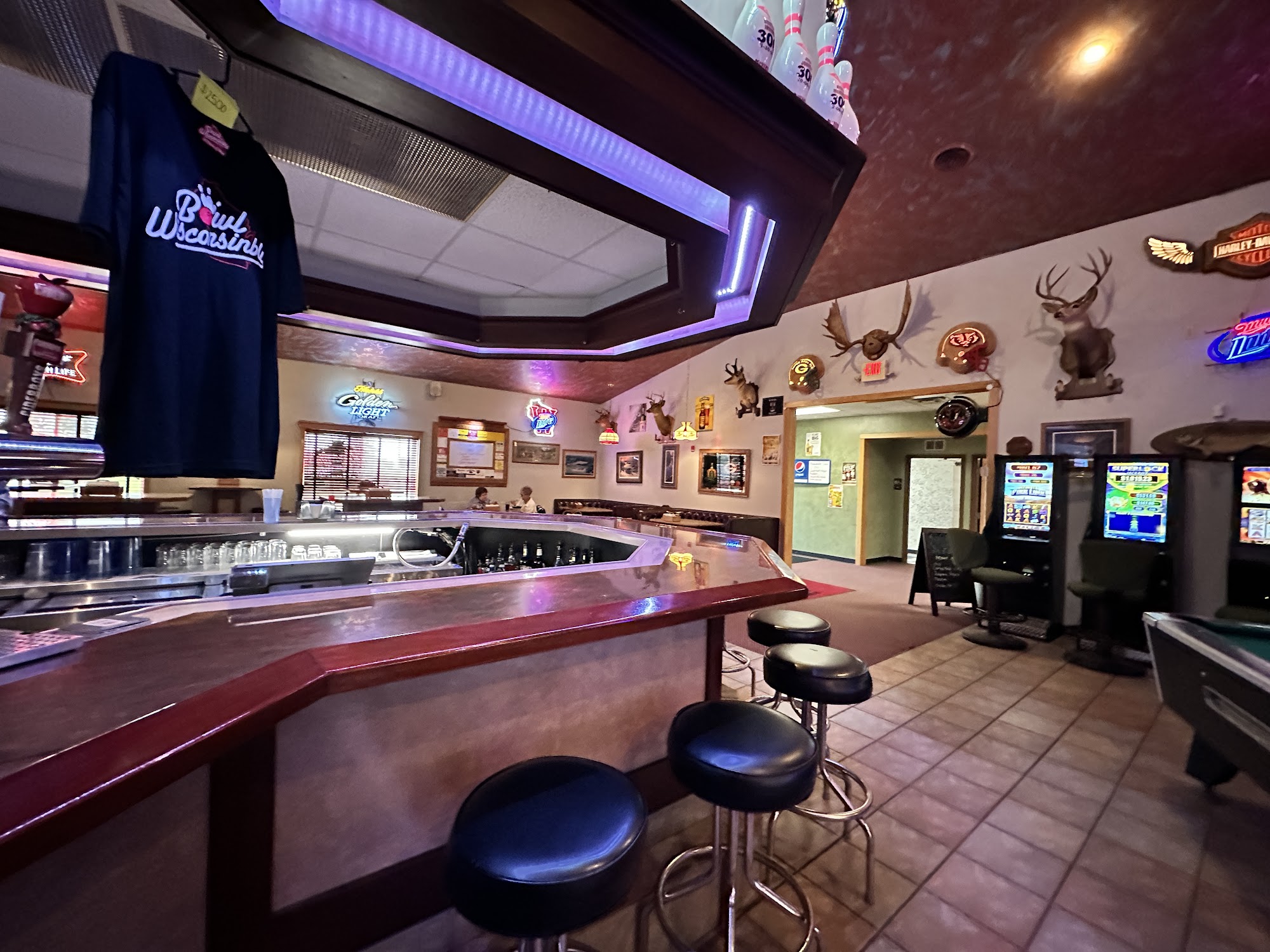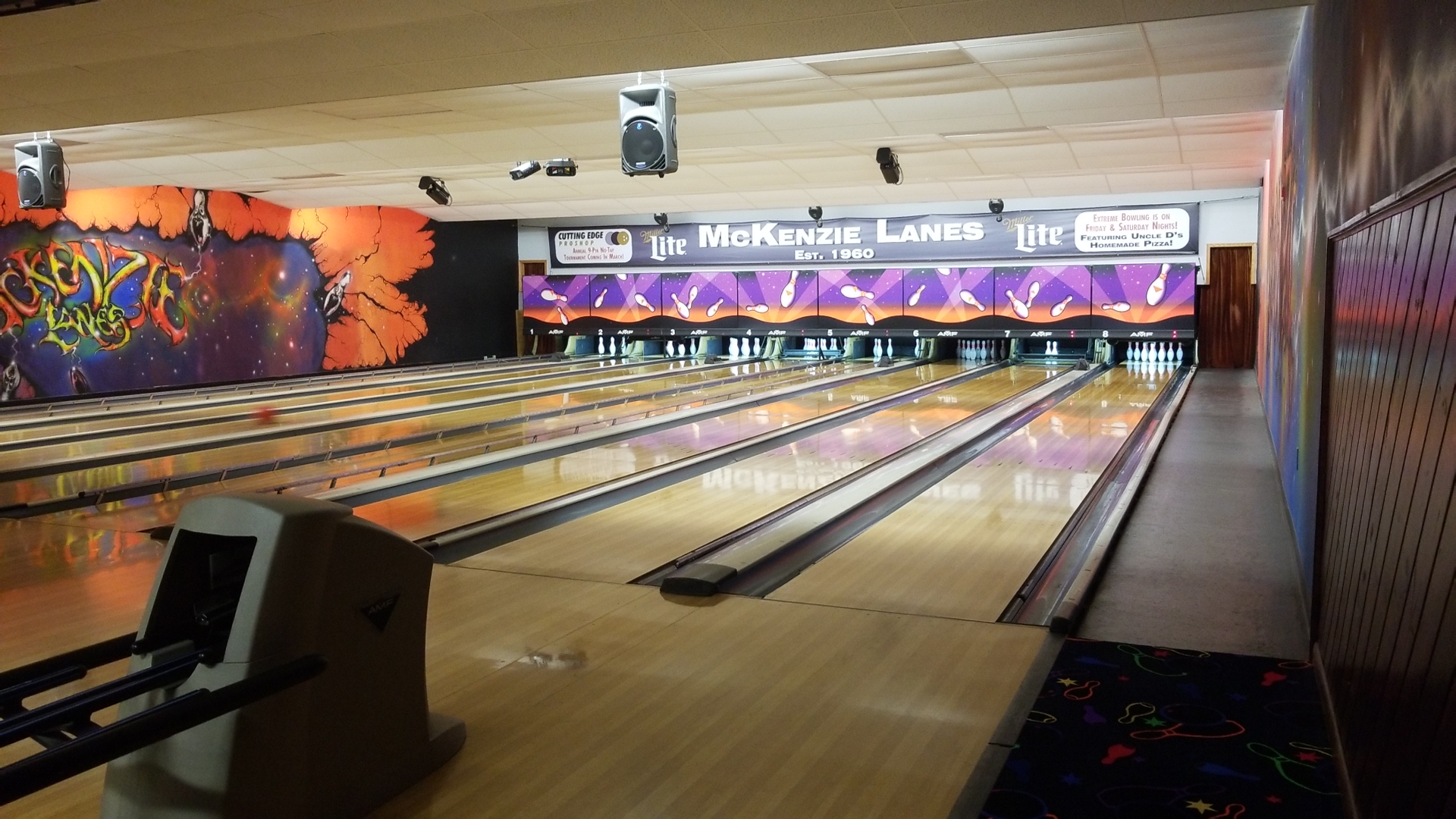 Small place. More of a bar than a bowling alley. The lanes we had (1-3) have a slight wear to them. When the kids rolled the balls always followed the same pattern. We had a blast though. All of the employees were kind and helpful.
