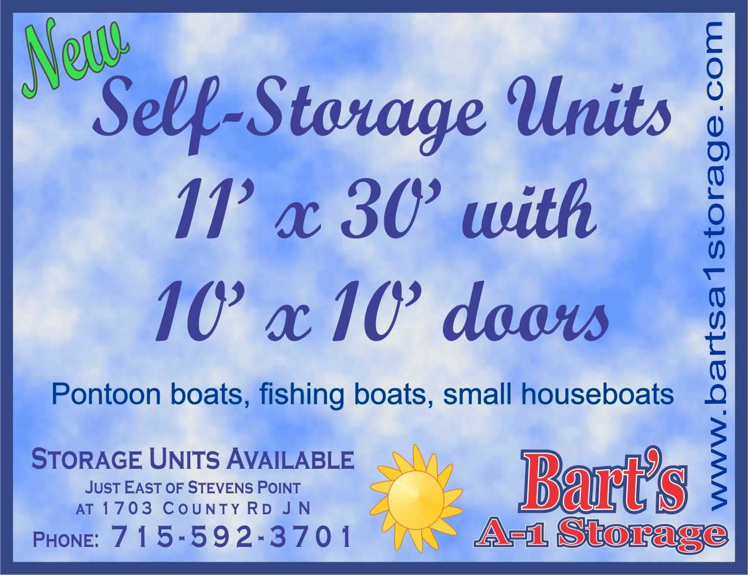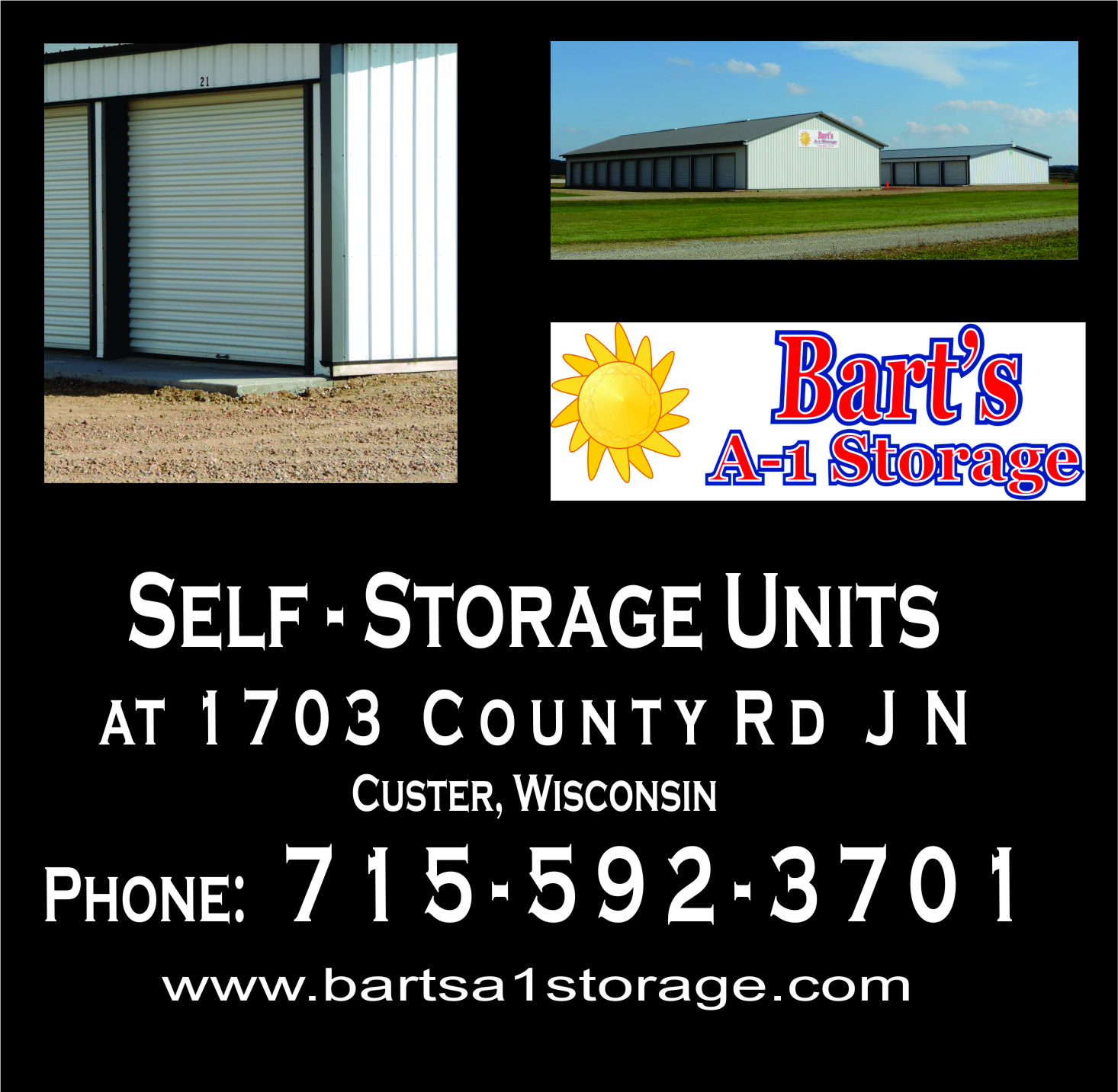 Self storage facility with over 100 units ranging from 10' wide and lengths ranging from 14' to 20'. Also have units that are 11' wide by 30' - 45' in length with 10' x 10' doors. Each unit has a concrete floor with a concrete platform in front of the door. We are located a few minutes East of Stevens Point on County Rd J N just South of Highway 66.