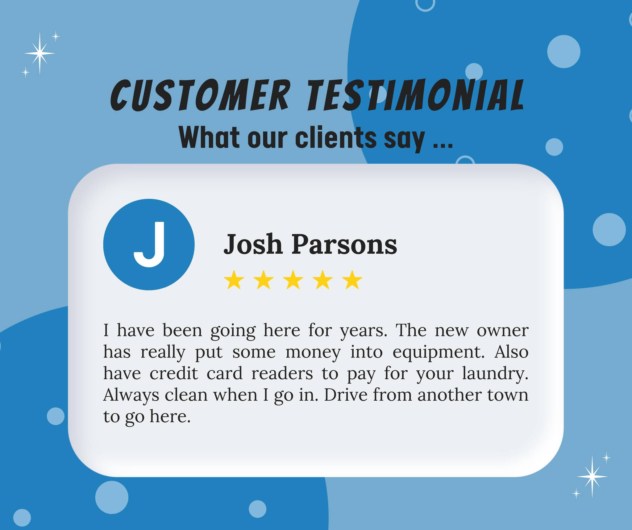 I have been going here for years. The new owner has really put some money into equipment. Also have credit card readers to pay for your laundry. Always clean when I go in. Drive from another town to go here.