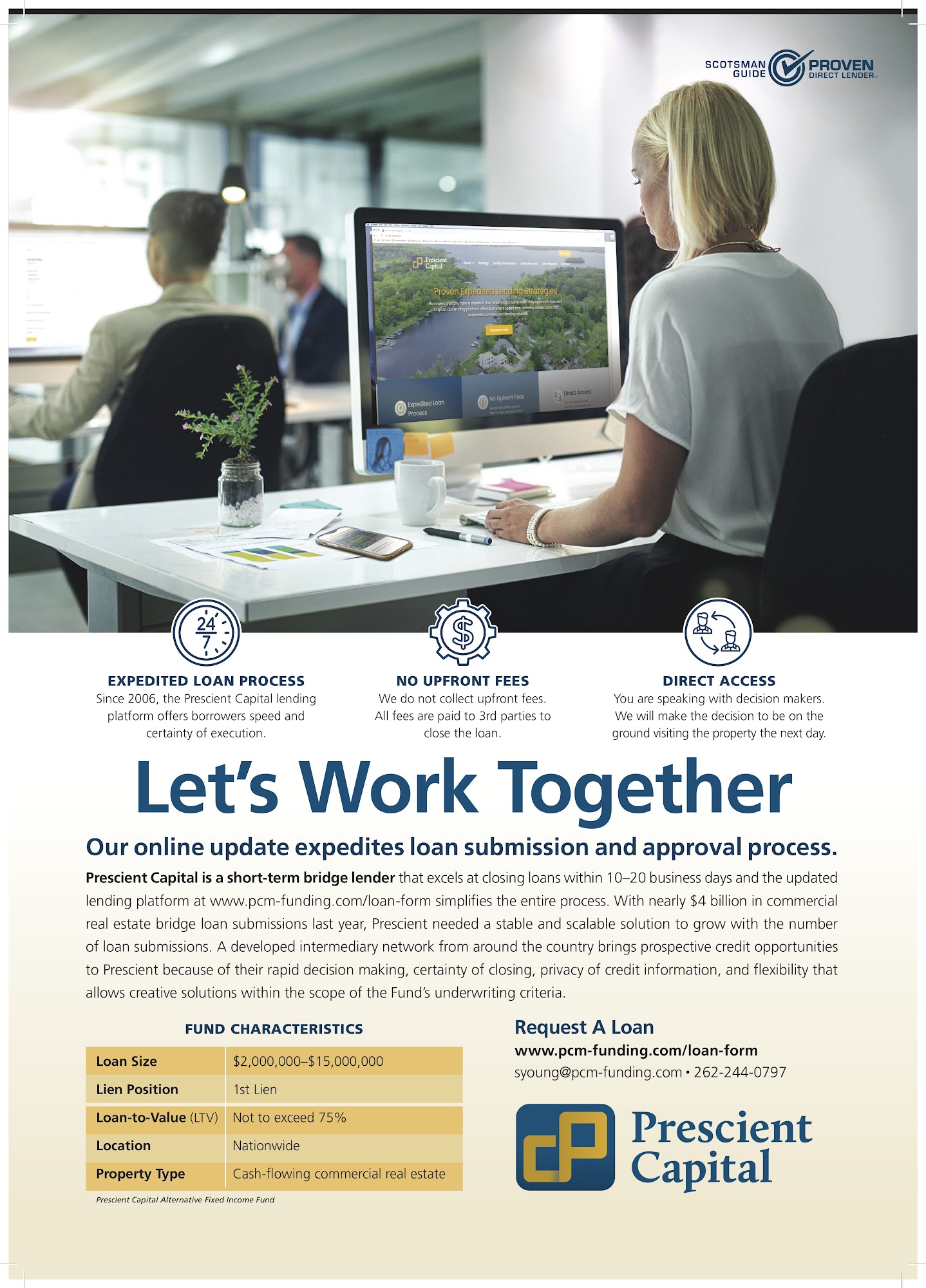 Prescient Capital is primarily focused on commercial real estate credit opportunities. Founded in 2006, we are a specialty finance company providing short-term loans supported by commercial real estate or other quick-sale collateral. Intermediaries bring prospective credit opportunities to Prescient Capital because of the rapid decision making and swift transaction closing, certainty of closing, privacy of credit information, flexibility, allowing creative solutions within the scope of Prescient Capital’s underwriting criteria and experienced professional management to analyze, structure and close the transaction.