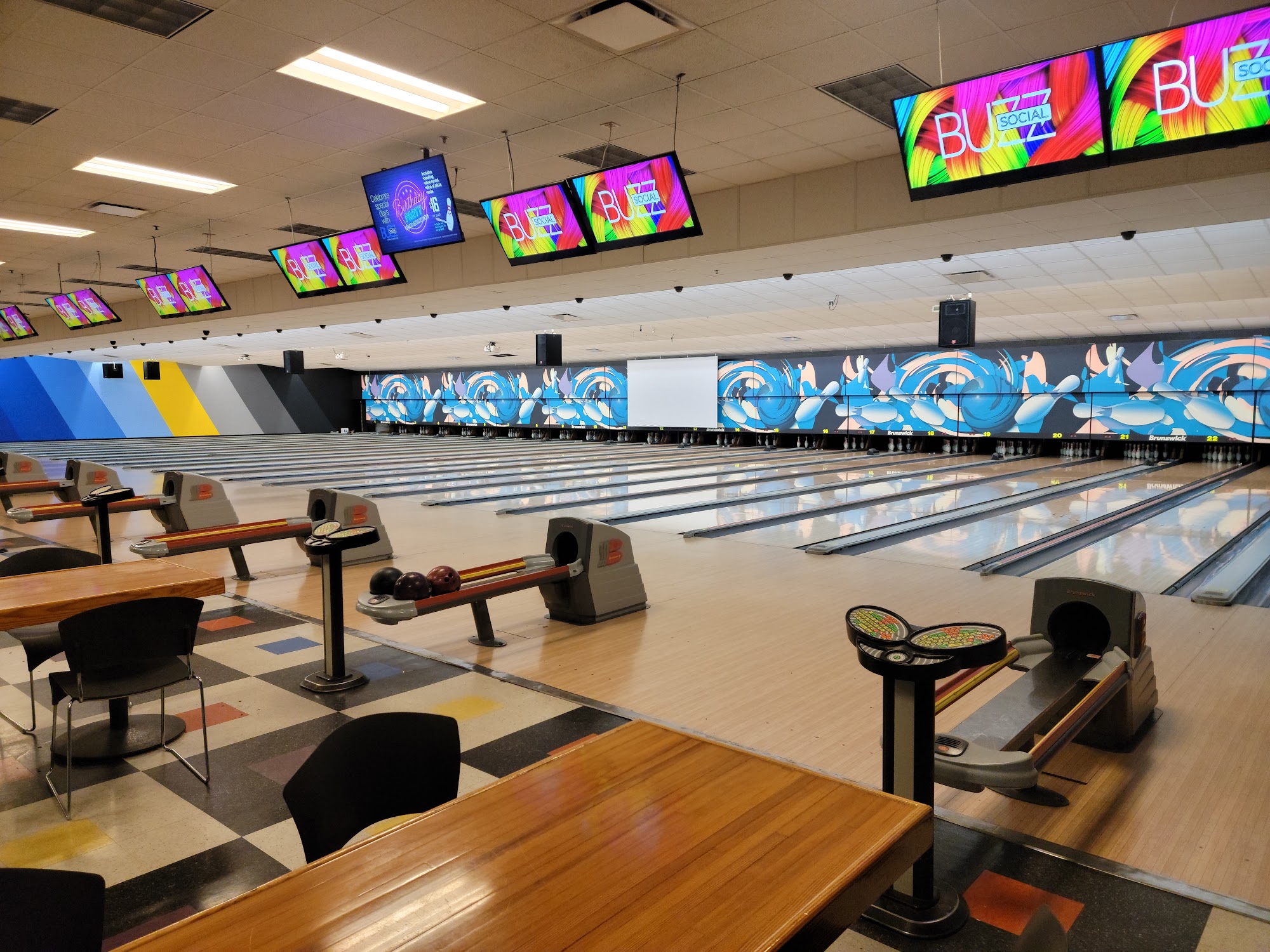 Nice center with 48 lanes split in half by the control desk. Big arcade and bar