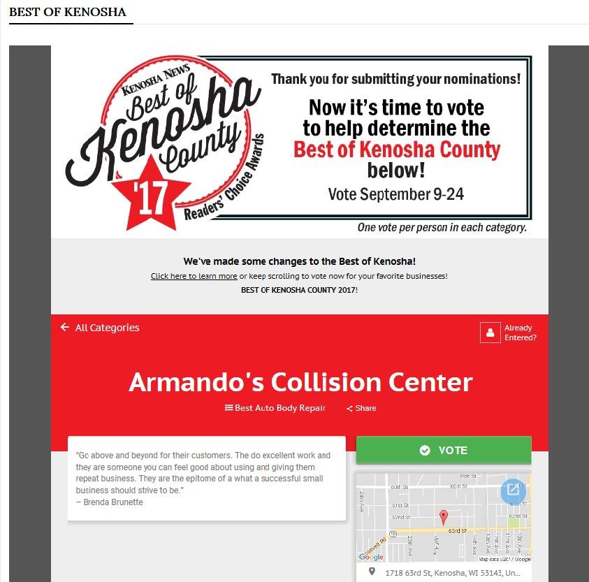 Second time here for different vehicles being repaired. Tom & his staff are amazing! We were given precise information about the repairs, and kept up to date all along. Very professional and personable. Highly recommend Armondo's Collission Center!