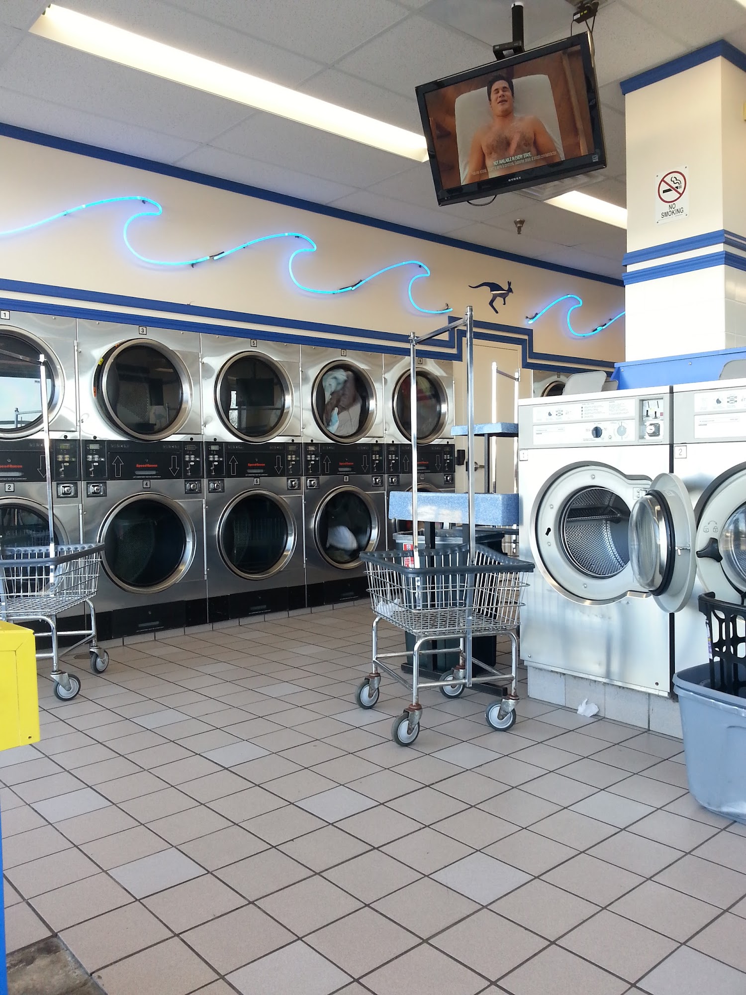 The Blue Kangaroo is a clean laundry facility with plenty of washers, dryers, and ample counter space for folding. It features a TV and a kids area. The pricing is generally considered fair, with dryers offering plenty of minutes per quarter. However, some washing machines have faded instructions and a couple have needed service for a long time. The place is typically busy but not too hectic. Reviews on staff are mixed, with some customers finding them friendly and helpful, while others describe encounters with rude attendants. One common suggestion is for the business to install app-pay machines. Overall, many customers enjoy and recommend it for being very clean and well-equipped.