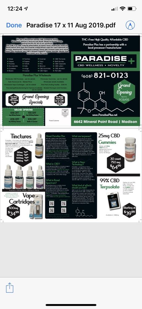 Paradise Plus is a premier CBD retailer located in Madison, WI, dedicated to promoting wellness through safe and natural products. They offer a diverse selection of high-quality items, including CBD oil, pet products, and flowers. Customers appreciate the friendly and knowledgeable staff who are eager to assist, especially returning customers. The shop has a relaxed atmosphere, modern decor, and an organized layout, making the shopping experience enjoyable. Visitors have highlighted the impressive variety of strains and products available, noting that the quality is top-notch and prices are reasonable. The staff is praised for their expertise, particularly in THC-A and other cannabis-related products. Paradise Plus also offers a 15% discount for military personnel and senior citizens aged 55 and older. Overall, this cannabis shop is recognized as a hidden gem in Madison, providing excellent service and a great selection, making it a favorite destination for both seasoned users and newcomers alike.
