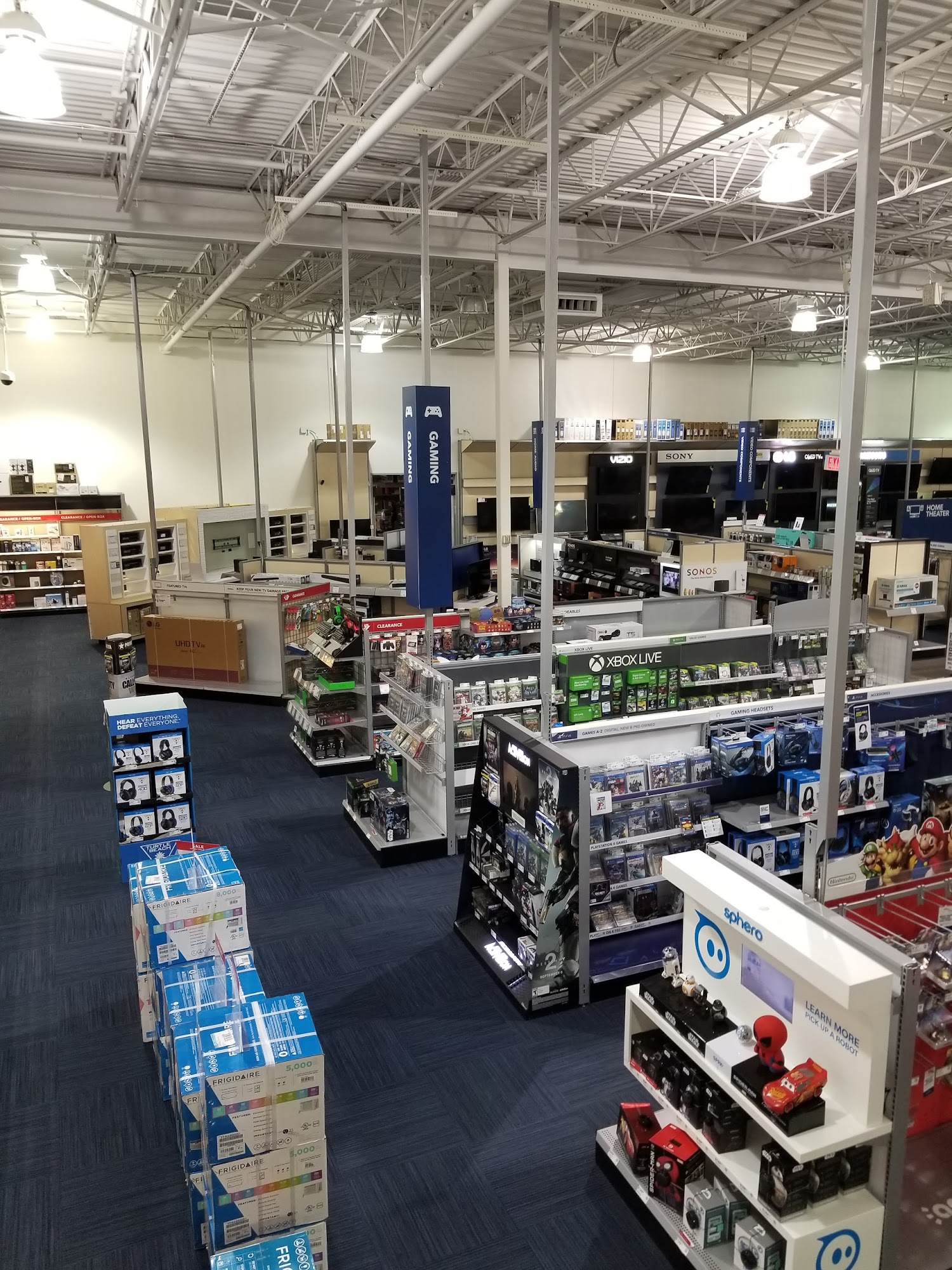 Best Buy is a store for purchasing technology like cameras, phones, TVs, fridges, and headphones. The store is lit up well, very clean, and the stock is always clean, organized, and up to date. They always have the best displays. The price is very competitive with online sources. The customer service is outstanding, great, and exceptional. Employees are friendly, informed, knowledgeable, helpful, patient, polite, and willing to help. They are easy to find in blue polo shirts and can provide advice and find options for a budget. They help select the best bang for the buck and can also install phone protectors. It is a nice store for a pleasant shopping experience.