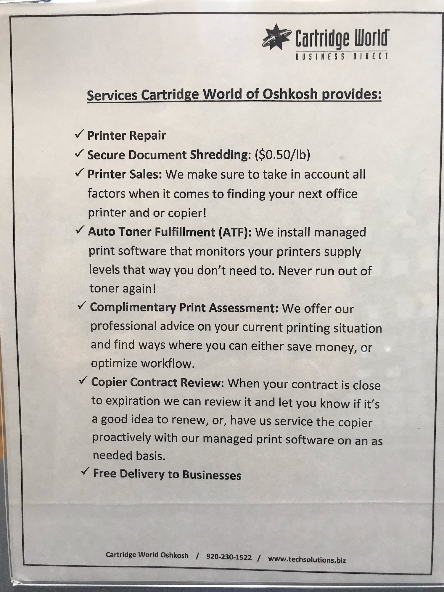 Micheal did a fabulous job fixing our printer. Prompt and respectful service. He even called to be sure we were ok with ordering the part before he ordered it. If you need help with your printer don't hesitate to call them!-Jeanne