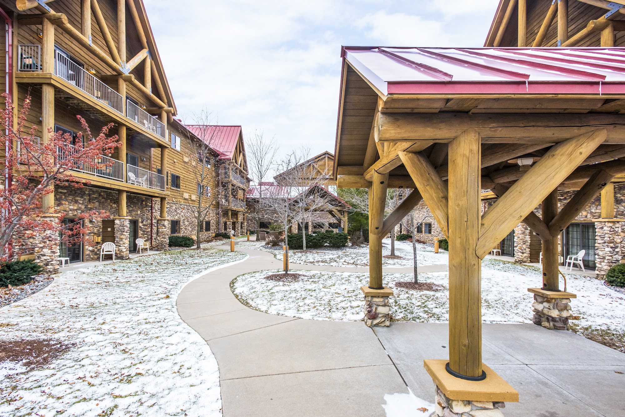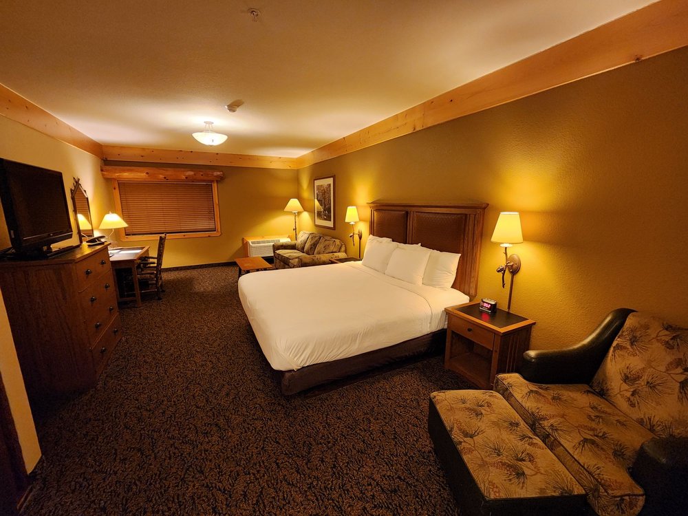 Log cabin vibe, modern amenities. Huge gym. Bid hot tub and pool, but waterpark is closed since last 5 yrs