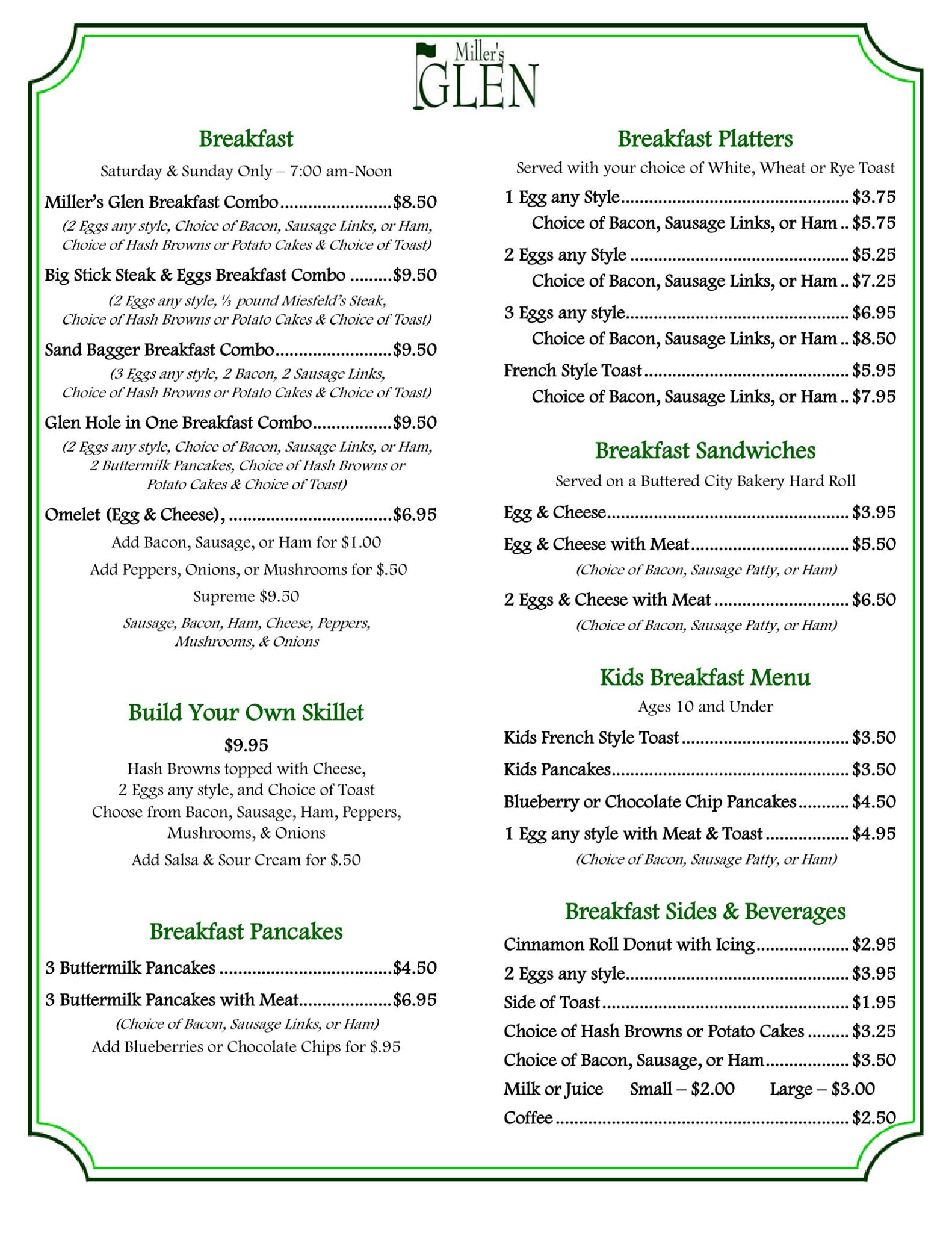 Miller's Glen Golf Course is a small 9‑hole course that is well kept even in late fall. The greens are in nice condition and the fairway needs little work. Service at the bar is fast and friendly, and the bar is full for a reason. Customers enjoy sandwiches, fish, and walleye dinners. The beer‑battered haddock is fluffy and moist, and the atmosphere is relaxed. Food is pretty good, with coleslaw that can be hit or miss. Overall, a good relaxing round with decent food and a nice bar area.