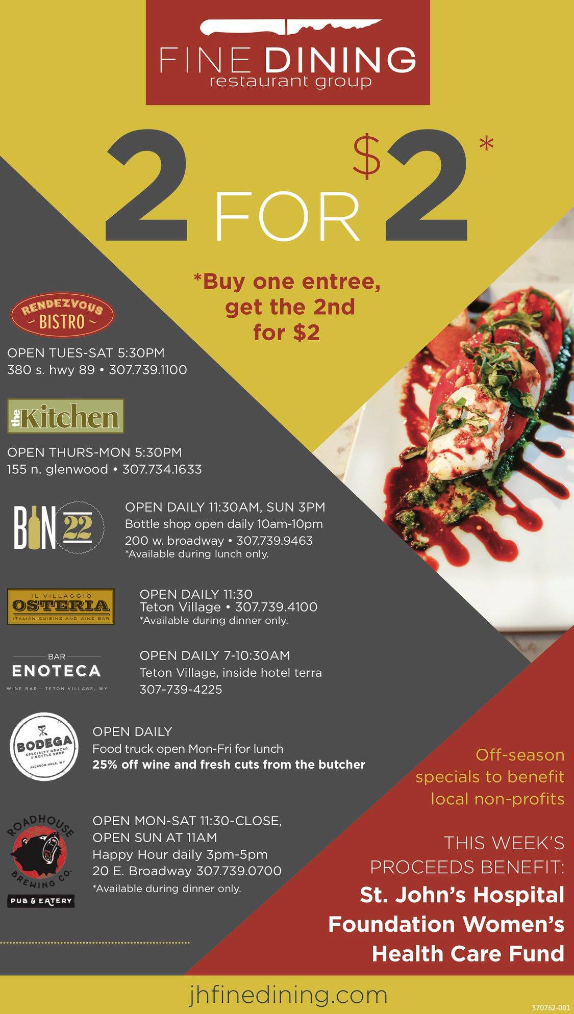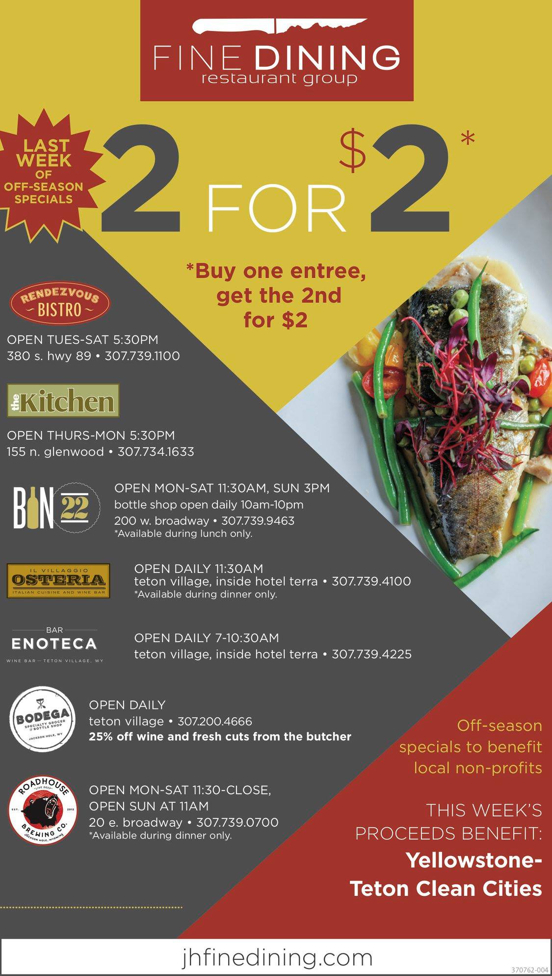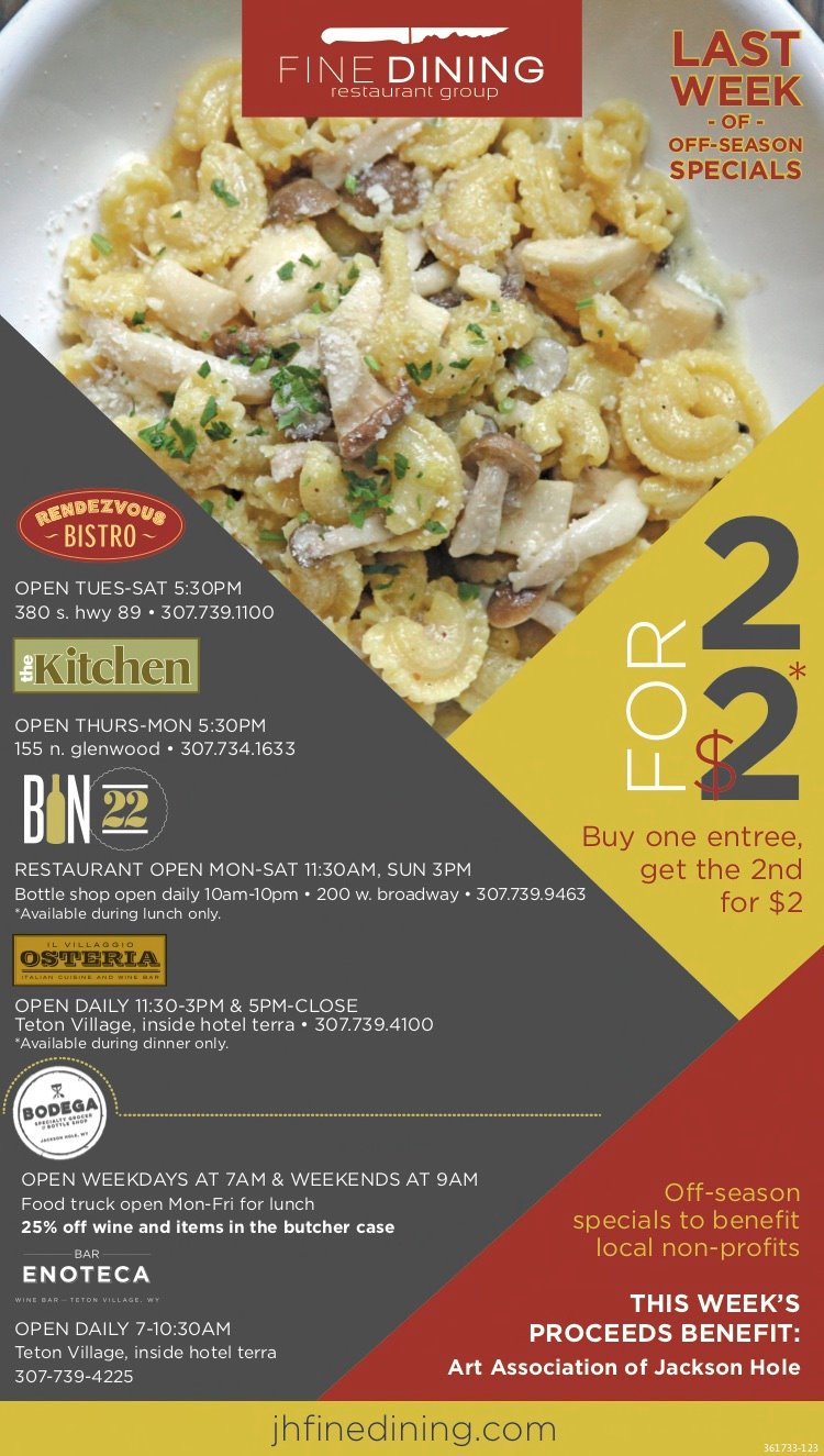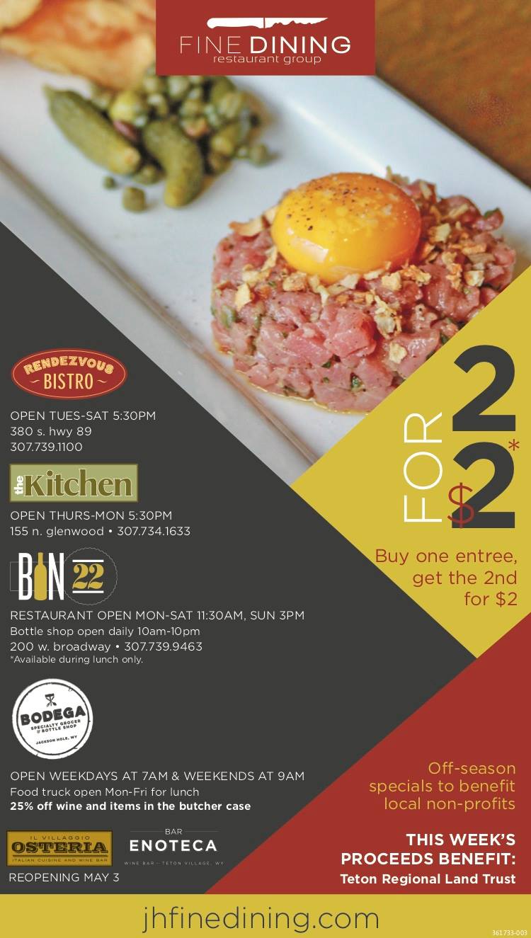 Fine Dining Restaurant Group was born in Jackson Hole by leading culinary minds Gavin Fine and Roger Freedman. Now encompassing five restaurants, a catering company, specialty grocer/bottle shop, craft sausage company and artisan ice cream brand, FDRG opened their first restaurant, Rendezvous Bistro, in 2001. The opening of the restaurant struck great success with both the local community and visitors, staking new territory in service standards, thoughtful food delivery, and dynamic spaces. Gavin and Roger went on to create Fine Dining Restaurant Group, including Bistro Catering, Il Villaggio Osteria, The Kitchen, Bin22, The Bistro, Bodega, Bar Enoteca, Cream + Sugar and Bovine + Swine.