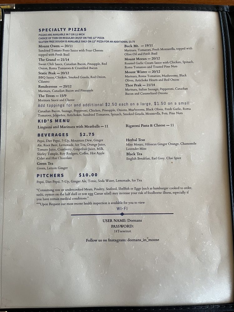 This is our 1st time visiting Dornan's & we can't wait to go back. We shared the rigatoni (large portion size & tastes like I make at home!) & a small Buck Mountain pizza that comes with slices of tomato, fresh mozzarella & basil. Both were delicious. Pizza crust was crispy on the bottom. So so good!