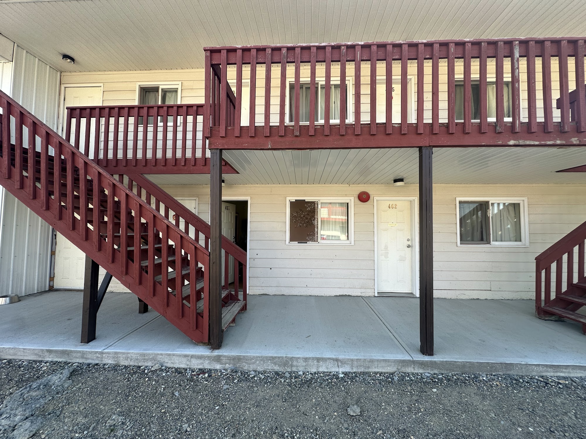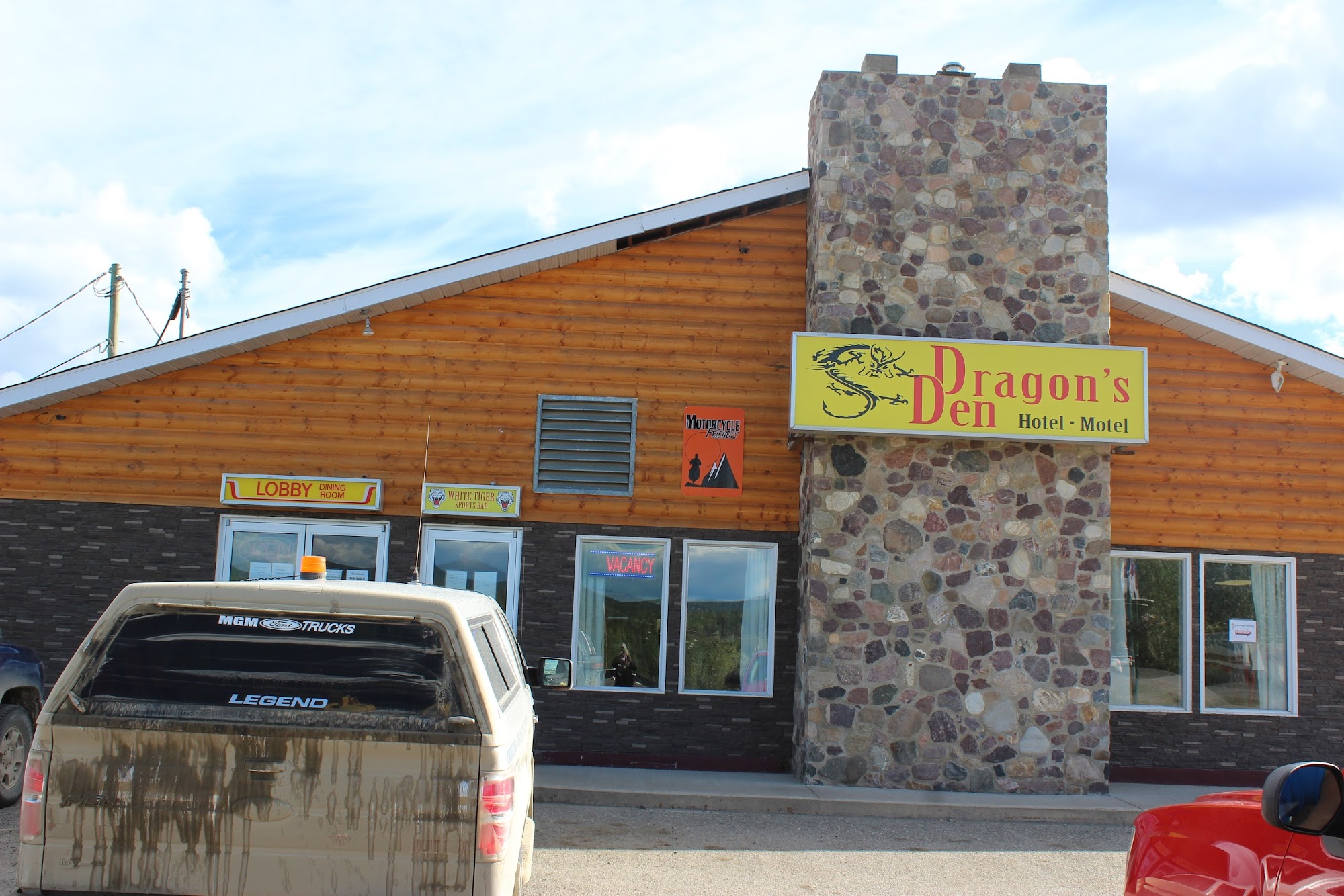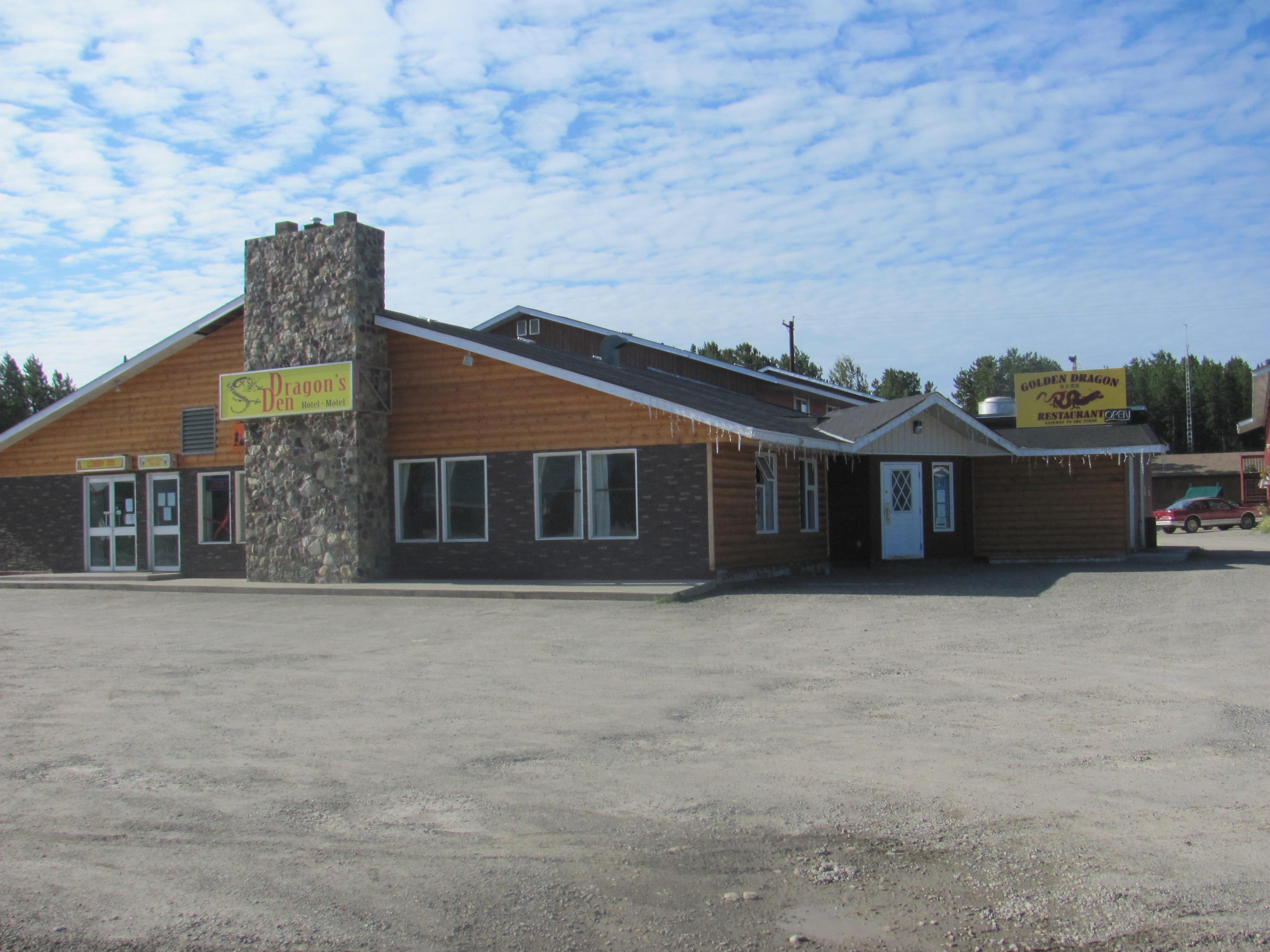 Dragon's Den Motel is a simple, pet-friendly accommodation located in a quiet corner of Watson Lake. The motel offers quaint, old-fashioned rooms with double beds, and while the furniture and bedding are outdated, the rooms are consistently reported as clean and comfortable. Guests appreciate the spacious parking area and the presence of cable TV and reliable WiFi, which provide some entertainment during their stay. The motel is a convenient choice for travelers passing through, especially those needing pet-friendly options, as it allows dogs and offers helpful, friendly staff. Check-in is handled at Andrea’s hotel nearby, as the lobby and restaurant at Dragon’s Den are often closed, which can be a minor inconvenience. The exterior of the building appears unkempt and the premises seem somewhat unmanaged, giving a rundown impression, though the inside is well-maintained. Guests suggest small improvements such as blackout curtains, towel hooks, and a communal area with a microwave and kettle to enhance comfort. Despite being on the pricier side due to limited local options, many guests find the price justified by the clean rooms, friendly service, and overall good value for a short resting place. Overall, Dragon’s Den Motel provides honest, basic accommodation for travelers seeking a quiet, well-kept place to stay.